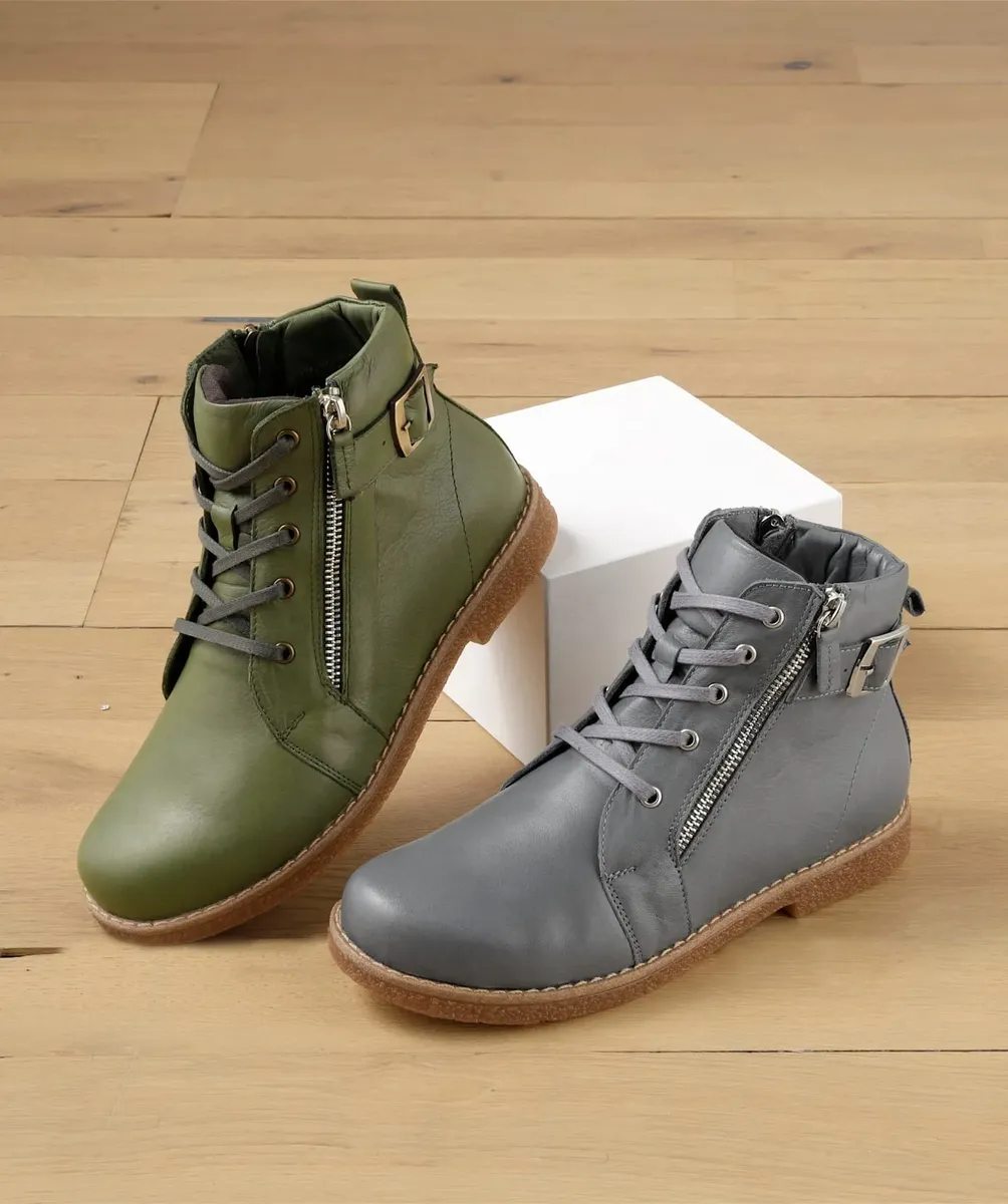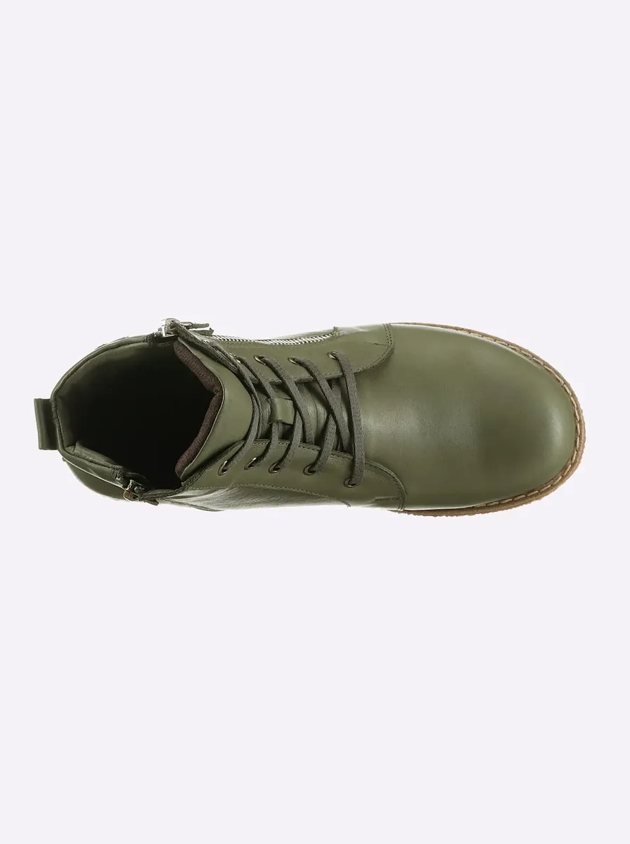 Ботильоны на шнуровке, повседневные и спортивные, из высококачественной воловьей кожи наппа. С декоративной застежкой, контрастными полосками и декоративной строчкой вдоль подошвы. Удобство благодаря съемной стельке и молнии. Текстильная подкладка. Кожаная стелька. Вал В/Ш ок. 10/25 см. Блочный каблук, высота ок. 25 мм.