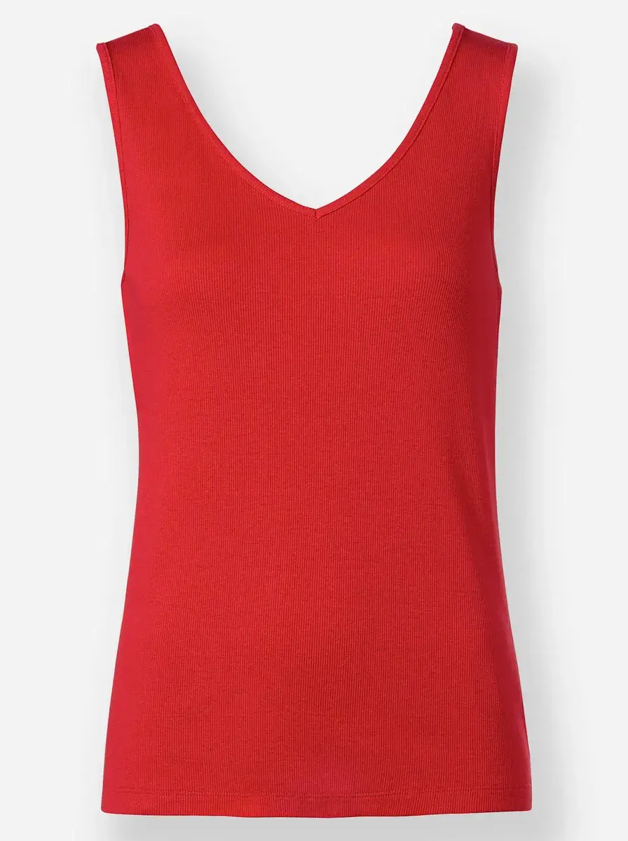 Майка с эластичной ребристой структурой и повседневным V-образным вырезом сзади и спереди. Широкие бретели. Поддержите инициативу «Хлопок, сделанный в Африке». 95% хлопок, 5% эластан. Машинная стирка.
