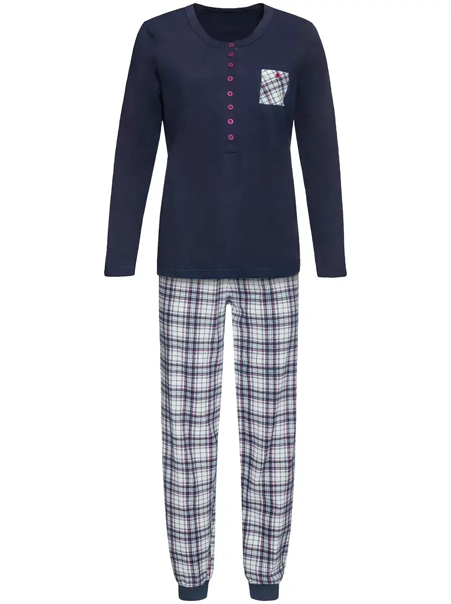 Бриллианты – козырь! Пижама из мягкого трикотажа. Круглый вырез горловины с длинной планкой и пуговицами контрастного цвета. Привлекательным элементом простого верха является небольшой клетчатый нагрудный карман слева. Брюки в клетку с эластичным поясом можно регулировать по ширине с помощью завязки. Манжеты контрастного цвета на концах штанин. 100% хлопок.