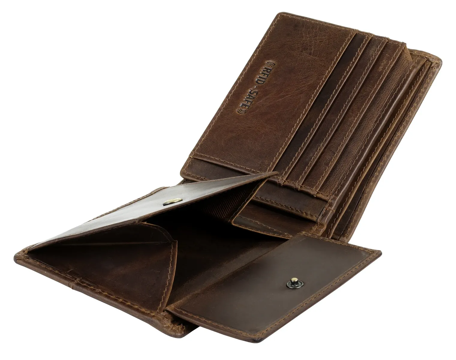 2 отделения для купюр, 8 отделений для карт, 4 отделения для вкладышей, 1 отделение для дисплея и 1 отделение для монет.