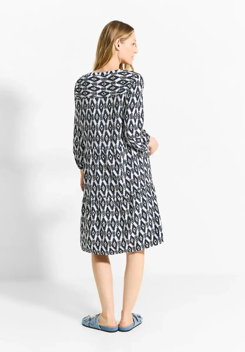Женское платье-туника CECIL с принтом, летнее платье с воланами, круглый вырез с разрезом, рукава 3/4 с манжетами и пуговицей, длина до колена, мягкая качественная вискоза. Платье-туника с минимальным принтом от CECIL для женщин – воздушное летнее платье с игривыми воланами. Круглый вырез с разрезом и рукава 3/4 с манжетами и пуговицей придают модели женственный вид. Благодаря мягкой вискозе и посадке длиной до колена она обеспечивает комфорт и стиль для теплых дней. Летнее платье с воланами, круглым вырезом с разрезом, рукавами 3/4 с манжетами и пуговицей, длиной до колена, из мягкой вискозы. Размеры для европейского размера M примерно: длина 113 см, обхват груди 100 см, ширина подола 111 см. Материал: 100 см.% вискозы. Особенности: длина до колена. Состав материала: 100% вискоза. Материал: 100% вискоза. Инструкция по уходу. Отбеливание: Не отбеливать. Инструкция по уходу. Гладить: Гладить при умеренной температуре (2 точки) / Гладить при умеренной температуре. Уход. Инструкция по уходу за текстилем: Не подвергать чистке (круг - крестик) / Не подвергать химической чистке Инструкции по уходу Сушка: Не использовать машинную сушку Инструкции по уходу Стирка: деликатный режим 30°Страна-производитель: INЦелевая группа: Женщины