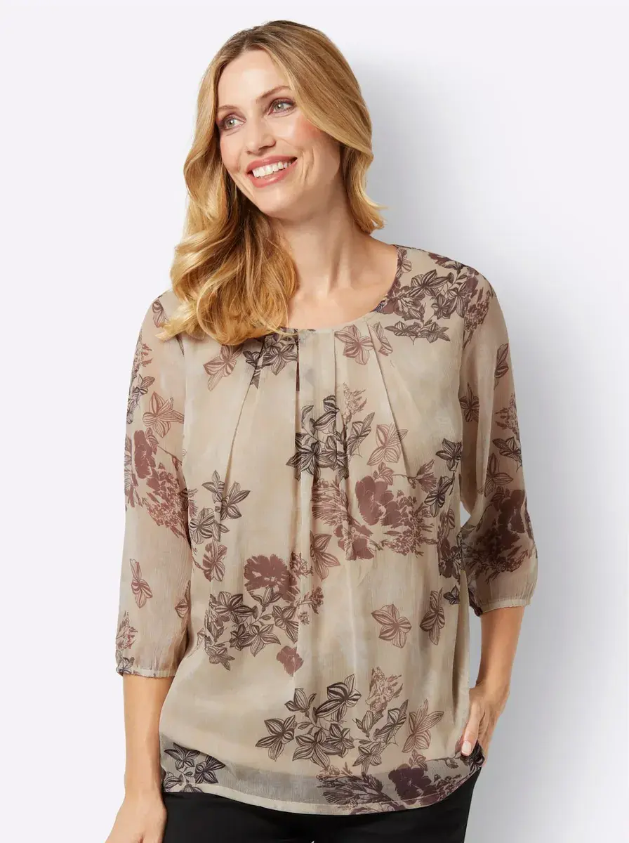 Женственная блузка без шнуровки из воздушного, легкого шифона с цветочным принтом. Передняя и задняя части обшиты непрозрачной подкладкой интерлок. Рукава 3/4 с эластичными манжетами остаются слегка прозрачными. Складки на круглом вырезе придают ему привлекательную ширину. Формируем вытачки для груди. 100% полиэстер. Подкладка: 100% полиэстер. Машинная стирка.