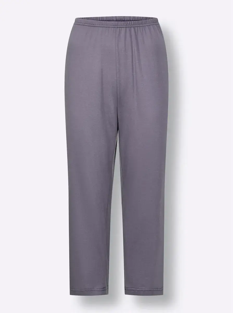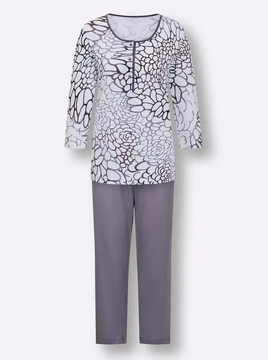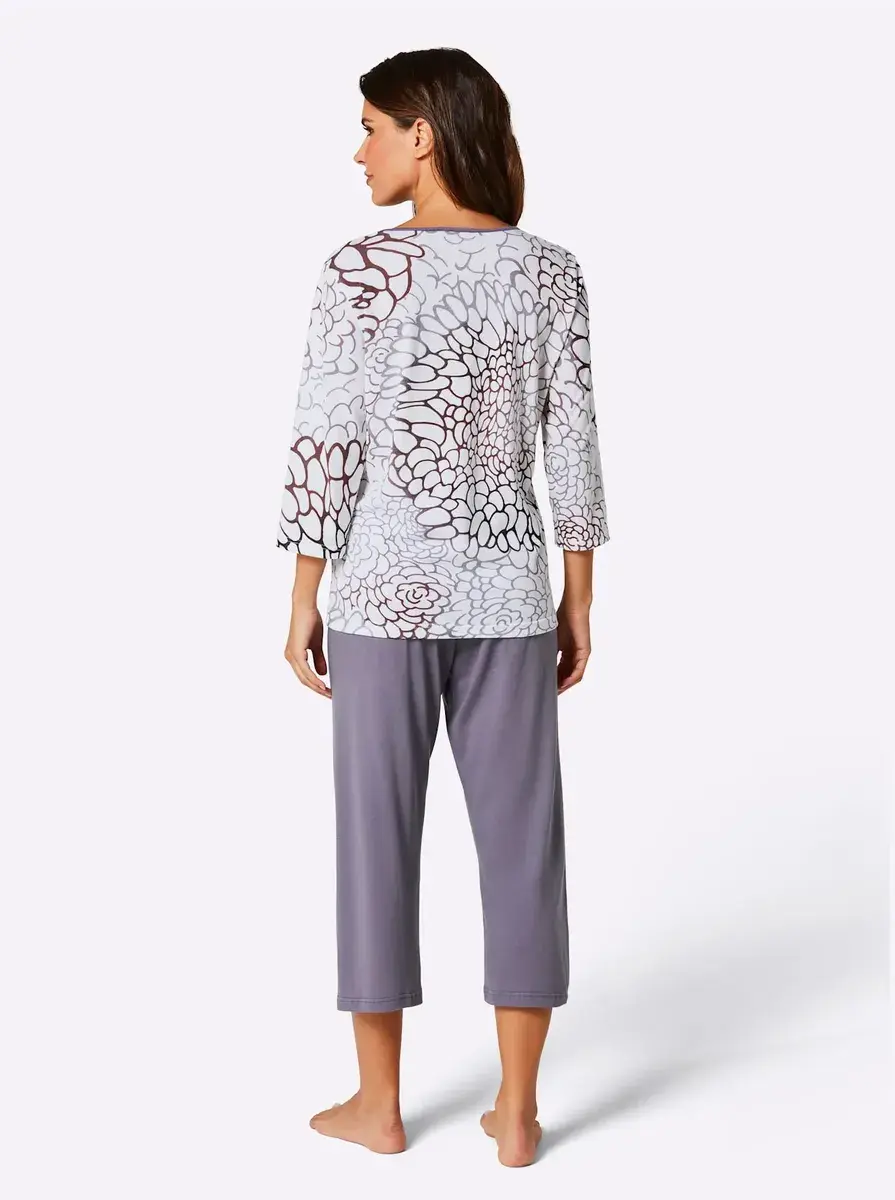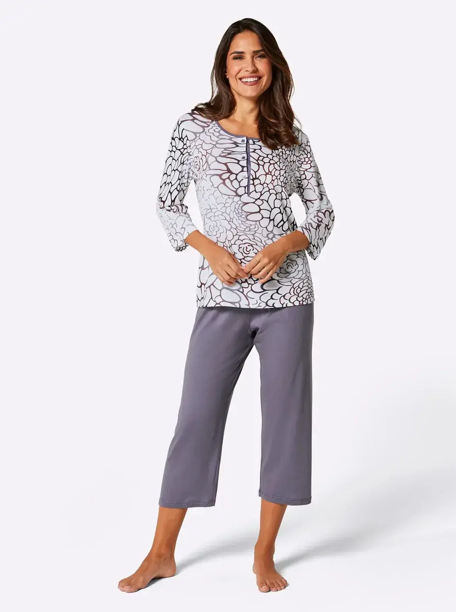 Мечтайте красиво в этой привлекательной пижаме из приятного мягкого трикотажа! Красивый топ с принтом, круглым вырезом, короткой планкой на пуговицах и рукавами 3/4. Однотонные брюки длиной 7/8 с эластичным поясом. 50% хлопок. 50% модальный.