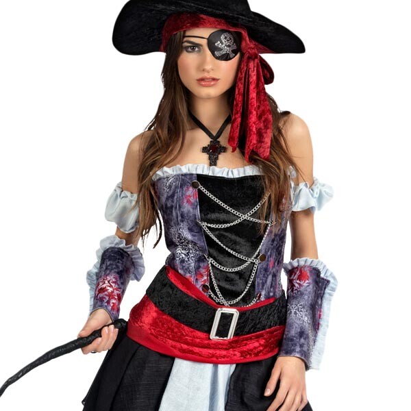 - Ола! На этом корабле главная женщина! Сексуальный костюм пирата с типичными пиратскими элементами и игривыми деталями: верх украшен голубыми рюшами, металлические цепочки придают ему единый вид. Вы можете носить маленькие рукава в качестве рукавов или в качестве украшения для рук, в зависимости от ваших предпочтений. Для рук также прилагаются две одинаковые грелки для рук. Короткая юбка с поясом на кулиске состоит из голубого и черного слоев, оба из легкой струящейся ткани. На талии широкий пояс из черно-красного бархата с серебряной пряжкой. И, наконец, вдобавок широкая бархатная шляпа с пришитым платком.