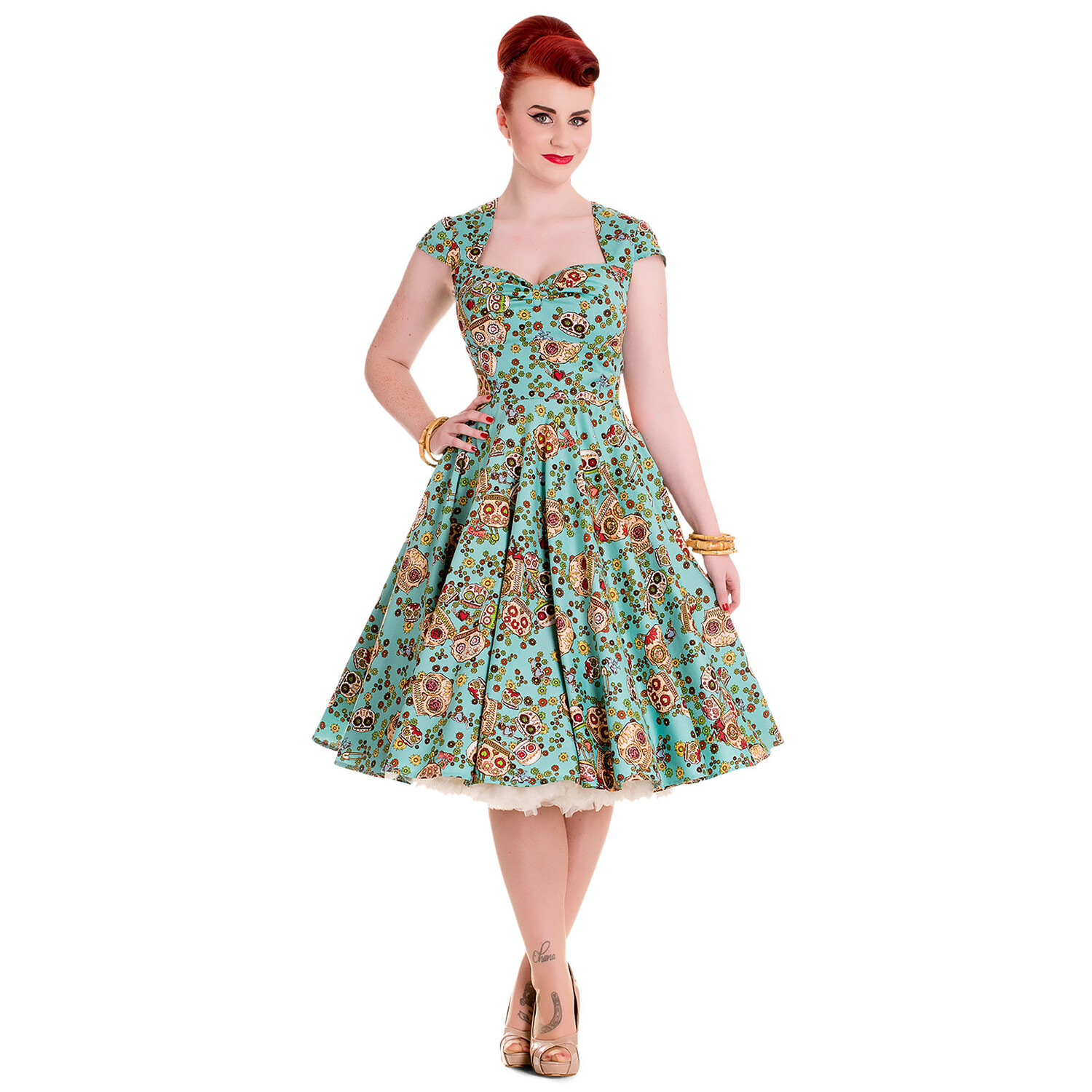 - Платье пятидесятых годов выполнено из приятной, прочной ткани, которая хорошо держит форму. , а юбка-солнце превратилась в идеально летящую юбку в стиле рок-н-ролл без нижней юбки. С подъюбником в тон она становится еще воздушнее и, главное, аутентичнее. Квадратный вырез с рюшами, короткие рукава и цветочный мотив в виде сладких сахарных черепов идеально дополняют ретро-образ.