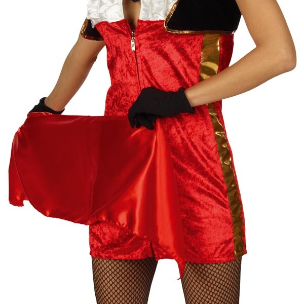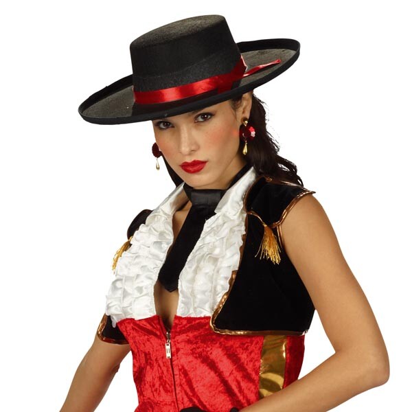 - в типичный наряд тореадора Теперь дамы также могут выйти на карнавальную арену. Короткое платье сияет ярким красным цветом и дополняется черным болеро. Красный шарф и черный галстук — прекрасные аксессуары. Мисс Матадор может сразиться с любым быком (бойцом).