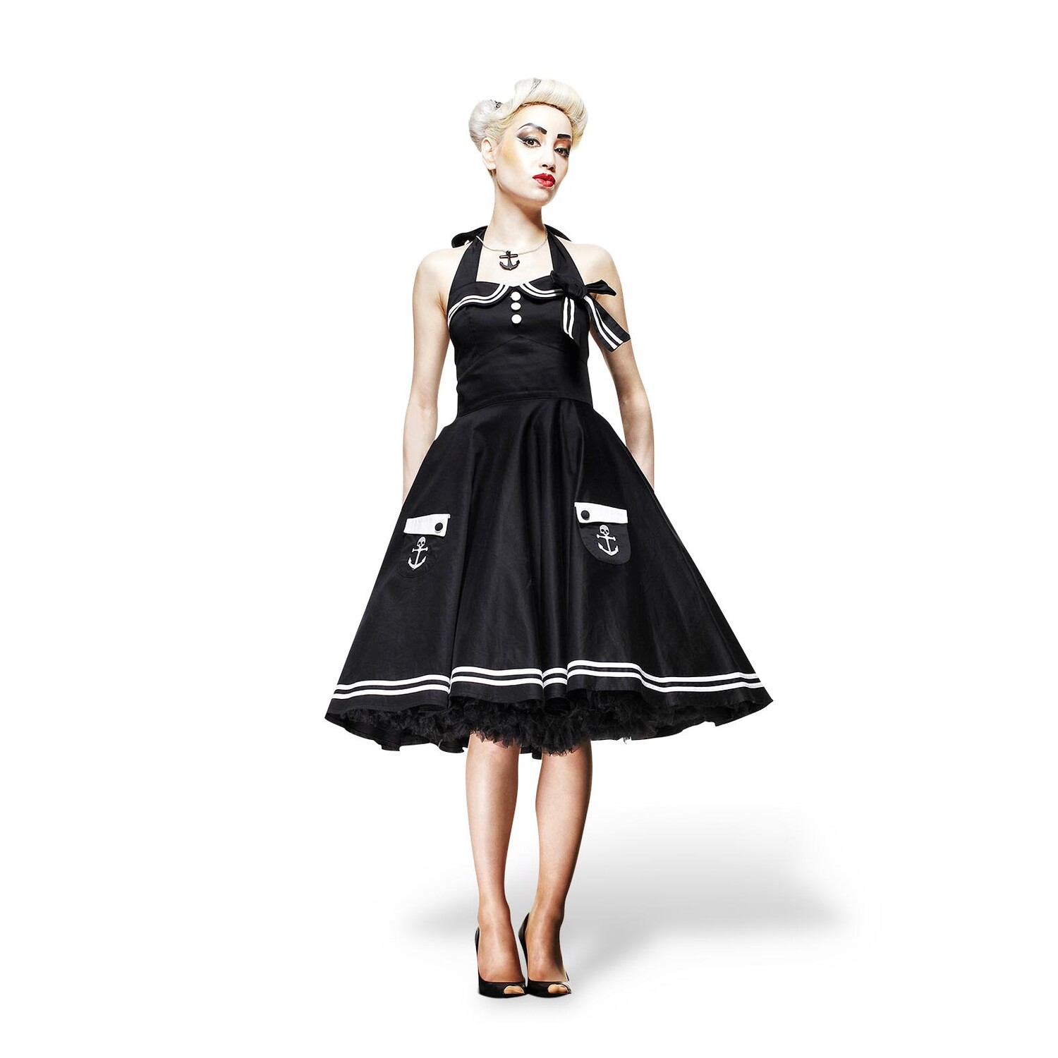 - Идеально одевается не только для пляжных вечеринок или отдыха на море. В этом элегантном платье в стиле рокабилли в матросском стиле вас можно будет увидеть на каждой вечеринке и в каждом ресторане! Глубокое черное платье с белыми контрастными швами привлекает внимание, а легкое блестящее мерцание делает его еще более праздничным. Чтобы все выглядело не слишком красиво, Hell Bunny London – лейбл производителя – добавил к сумкам модную вышивку черепа. Платье Fifties выполнено из красивой прочной ткани, которая хорошо держит форму и создает идеально струящуюся юбку в стиле рок-н-ролл даже без нижней юбки. С подходящей юбкой оно становится еще более воздушным и, прежде всего, более аутентичным.
