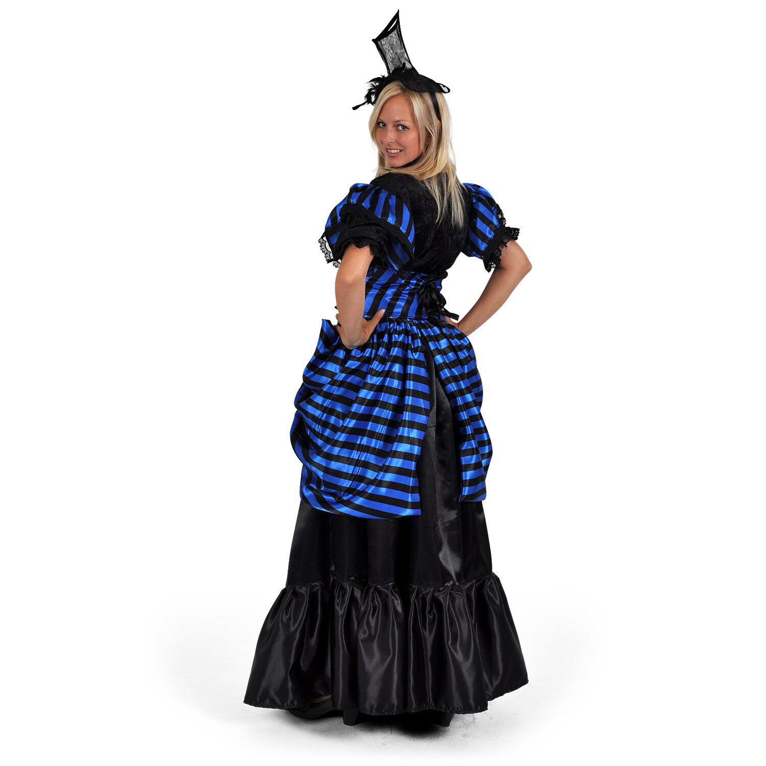 - Костюм включает в себя юбку в пол с завязанным подолом и блузку на длинной молнии. сзади широкий пояс - тоже завязанный сзади и наконец нежный головной убор в виде повязки с кружевной шапочкой. Что интересно в этом костюме, так это не только аутентичный крой того периода, но и игра блестящего атласа - синих и черных полосок и глубокого черного уютного бархата.