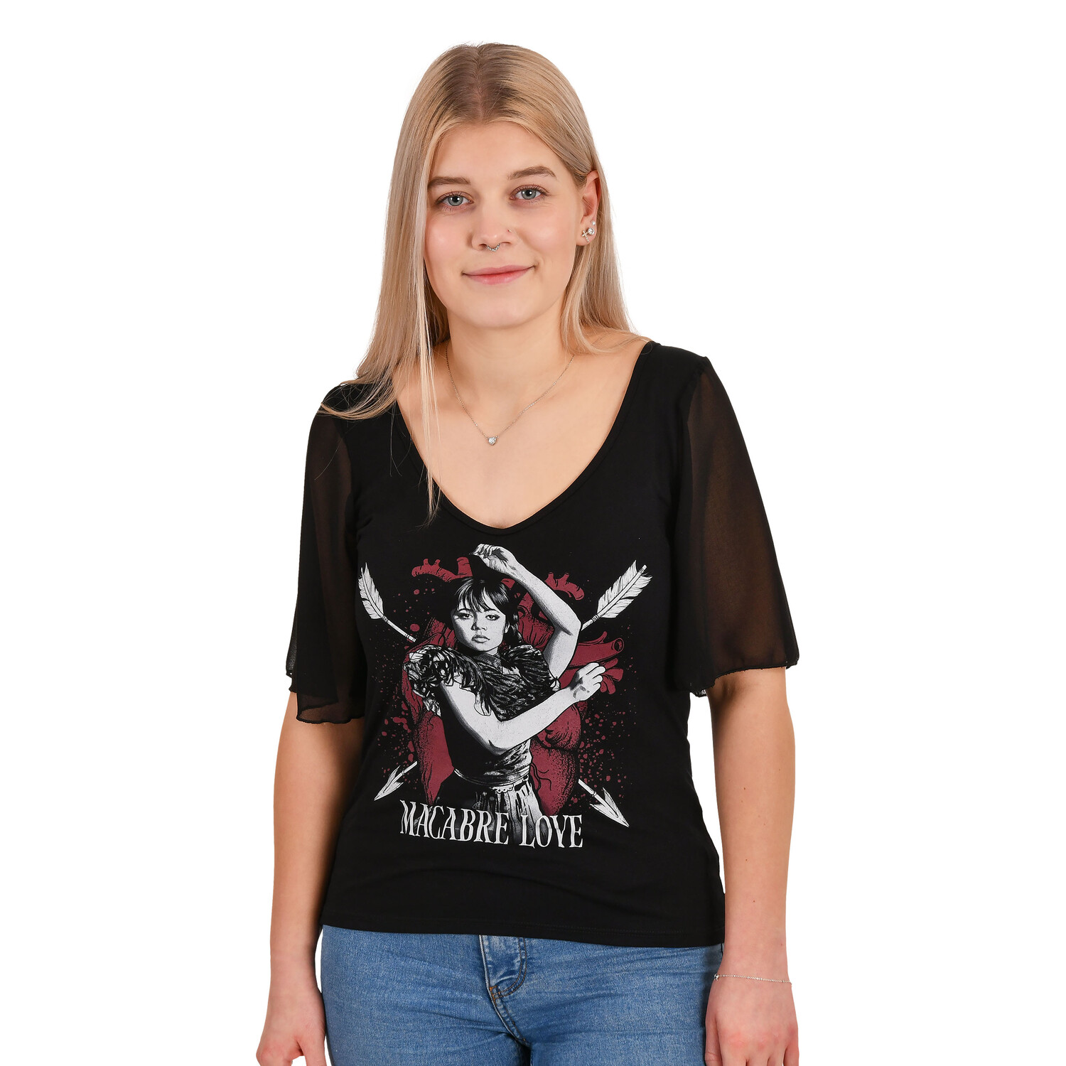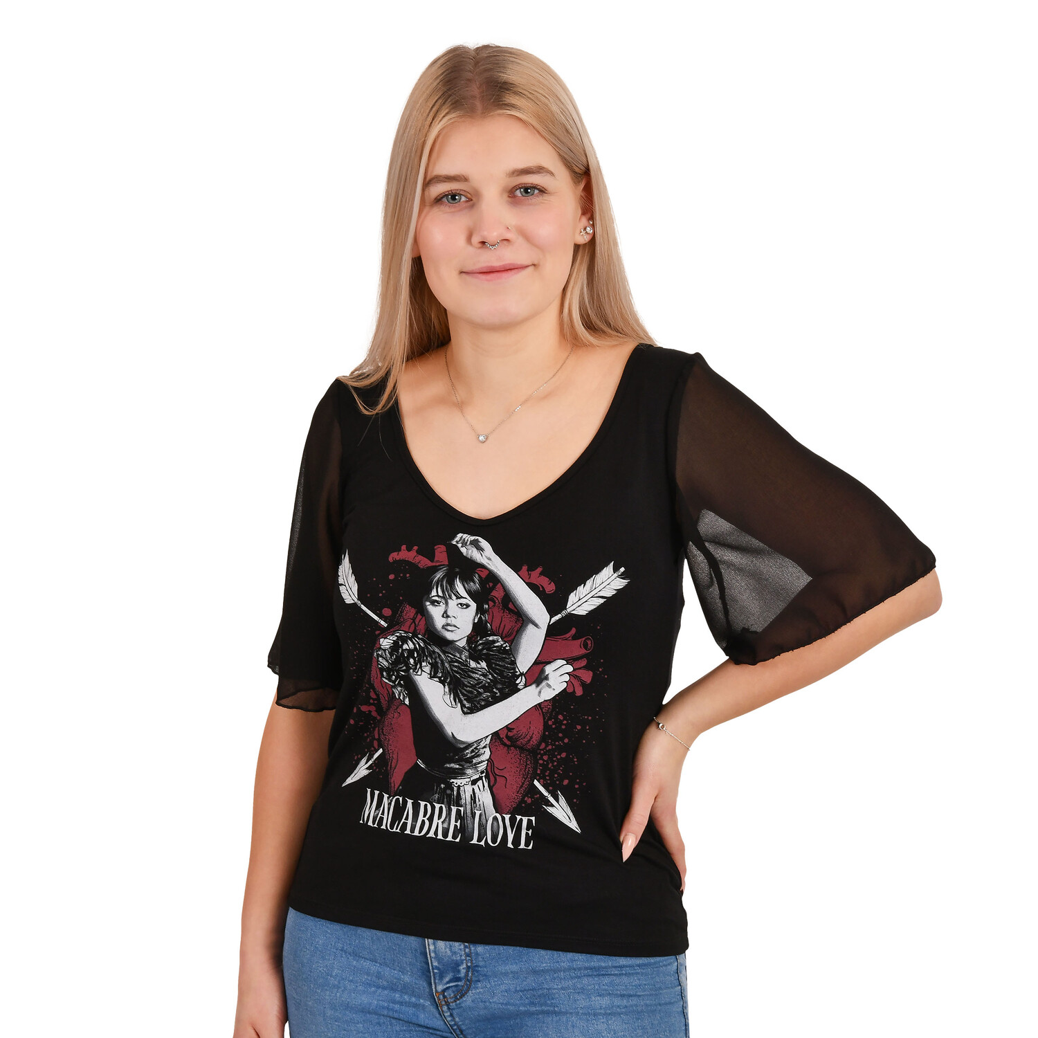 - принт с изображением Уэнсдей Аддамс и надписью «Macabre Love» спереди