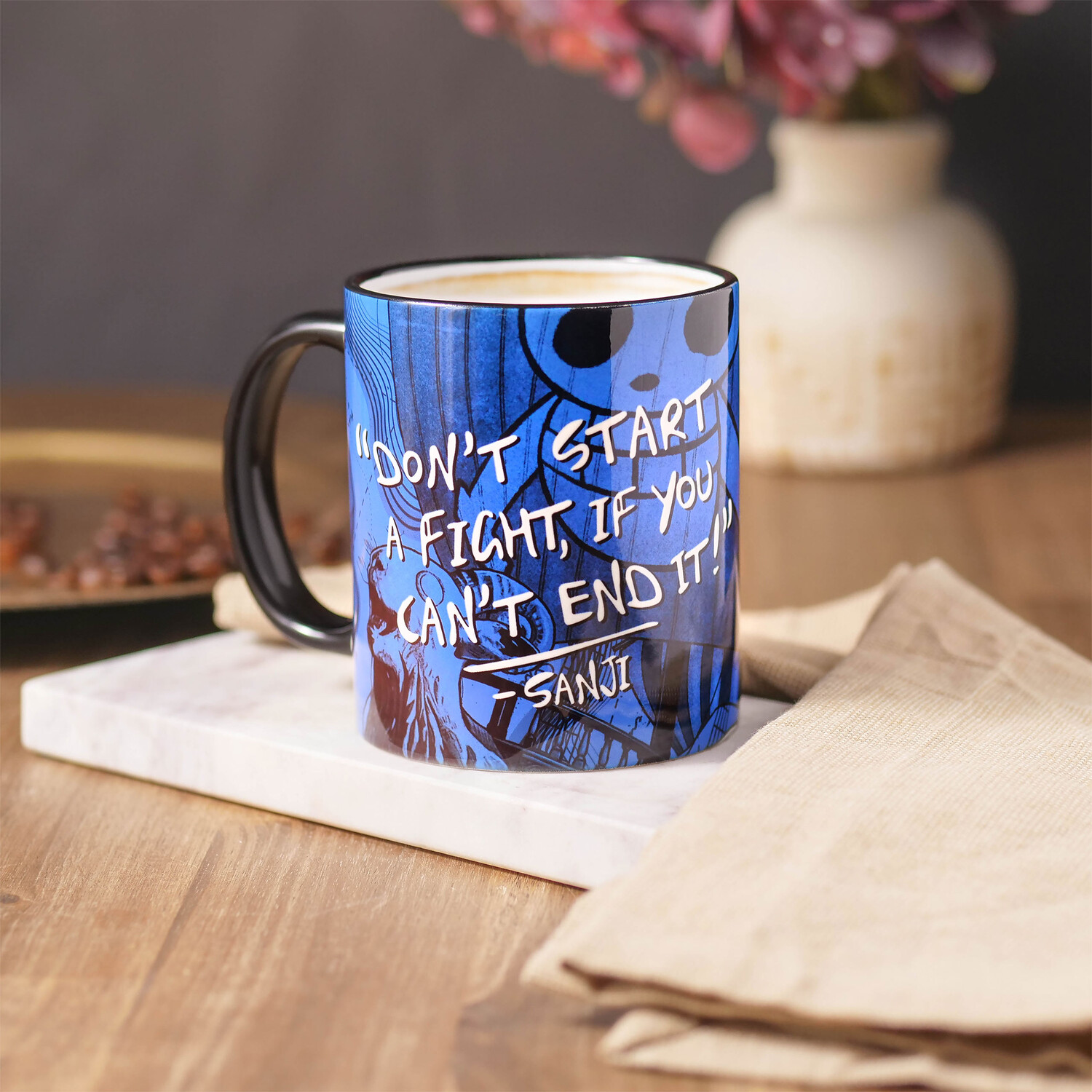 - Готовы выпить кофе с удовольствием? С официально лицензированной кружкой «Sanji End a Fight» из сериала One Piece от Netflix вы можете начать свой день с размаха! Крутой мотив Санджи Винсмока и яркая надпись «Не начинай драку, если не можешь ее закончить!» вызвать улыбку на лице каждого фаната. В чашке объемом 320 мл достаточно места для утреннего кофе или горячего шоколада. Высота 10 см, идеально лежит в руке. И самое главное: его можно мыть в посудомоечной машине и использовать в микроволновой печи. Таким образом, вы сможете подогреть кофе, если последний эпизод One Piece занял больше времени, чем ожидалось. Принесите домой кусочек любимого сериала и покажите всем, что вы настоящий фанат One Piece!