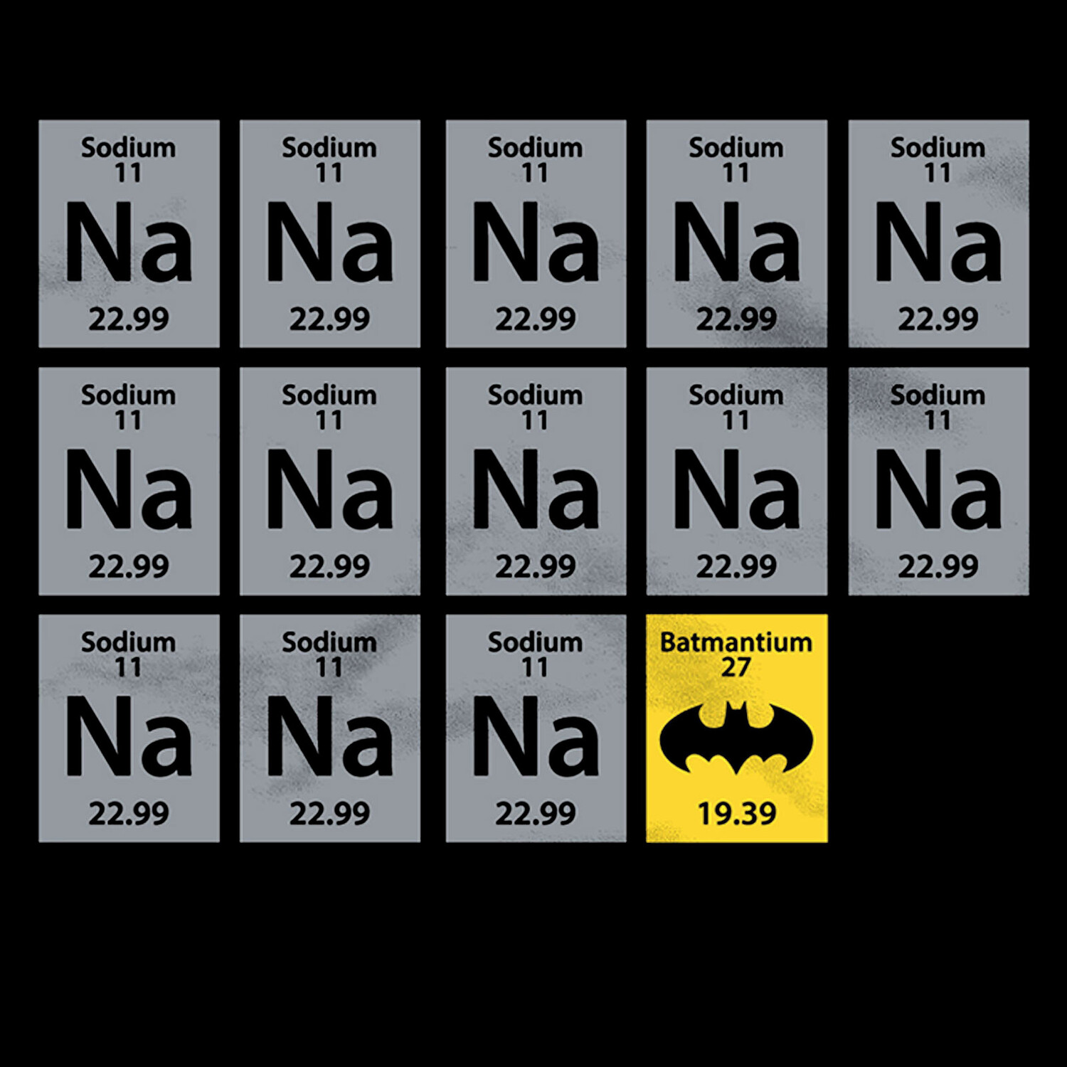 - Забавно, как оригинально: Бэтмен - Футболка «Химия». Этот принт спереди будет сразу заметен инсайдерам и сделает вас узнаваемым поклонником Бэтмена. Для всех остальных это просто немного другая таблица Менделеева...