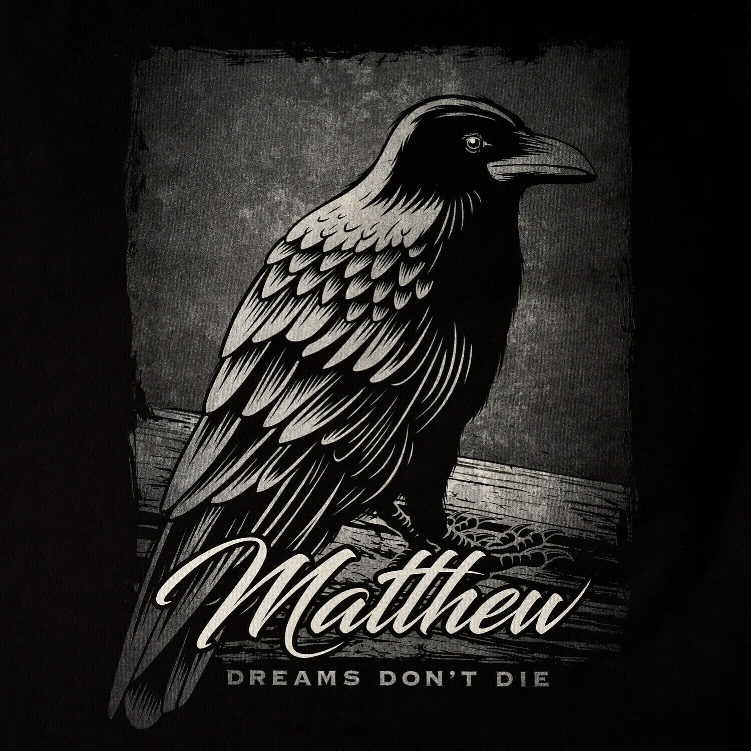 - большой принт спереди с изображением ворона Мэтью и надписью «Dreams not Die»