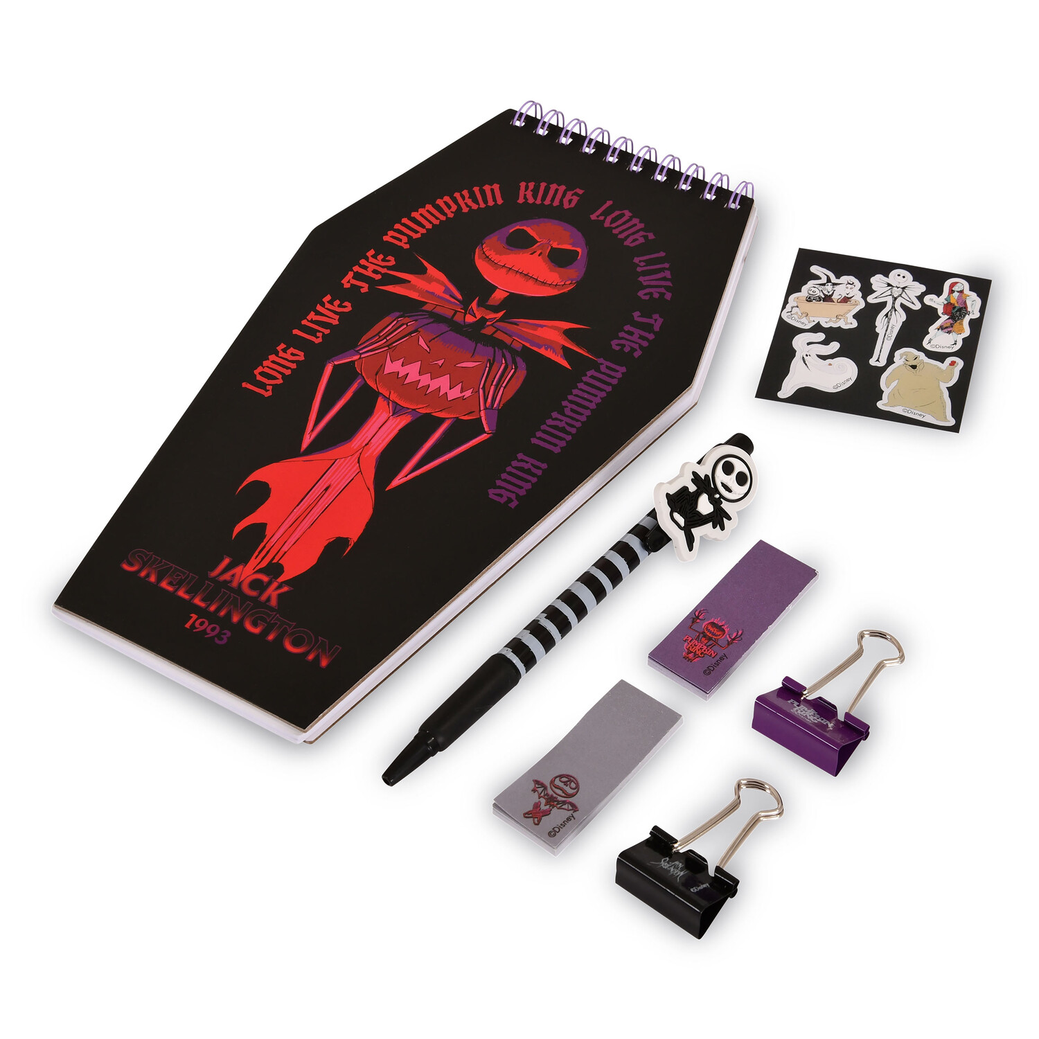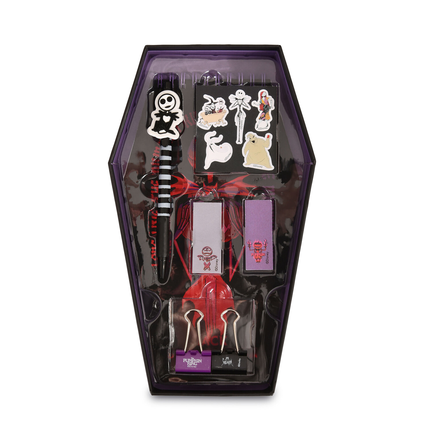 - Приготовьтесь погрузиться в жуткий, но увлекательный мир «Кошмара» Тима Бертона Перед Рождеством» с этим официально лицензированным письменным набором! В наборе есть все необходимое, чтобы придать вашему столу нотку Хэллоуина. Шариковая ручка с характерным дизайном Джека Скеллингтона, два жутких металлических зажима, два липких маркера и лист наклеек с пятью наклейками с персонажами, включая Салли, Джека и милого пса-призрака Зеро. Шариковая ручка пишет черным цветом, что соответствует мрачной эстетике фильма. И лучшая часть? Все поставляется в подарочной коробке в форме гроба, идеально подходящей для украшения! С этим набором вы сможете оживить свою повседневную жизнь щепоткой волшебства «Кошмара перед Рождеством».