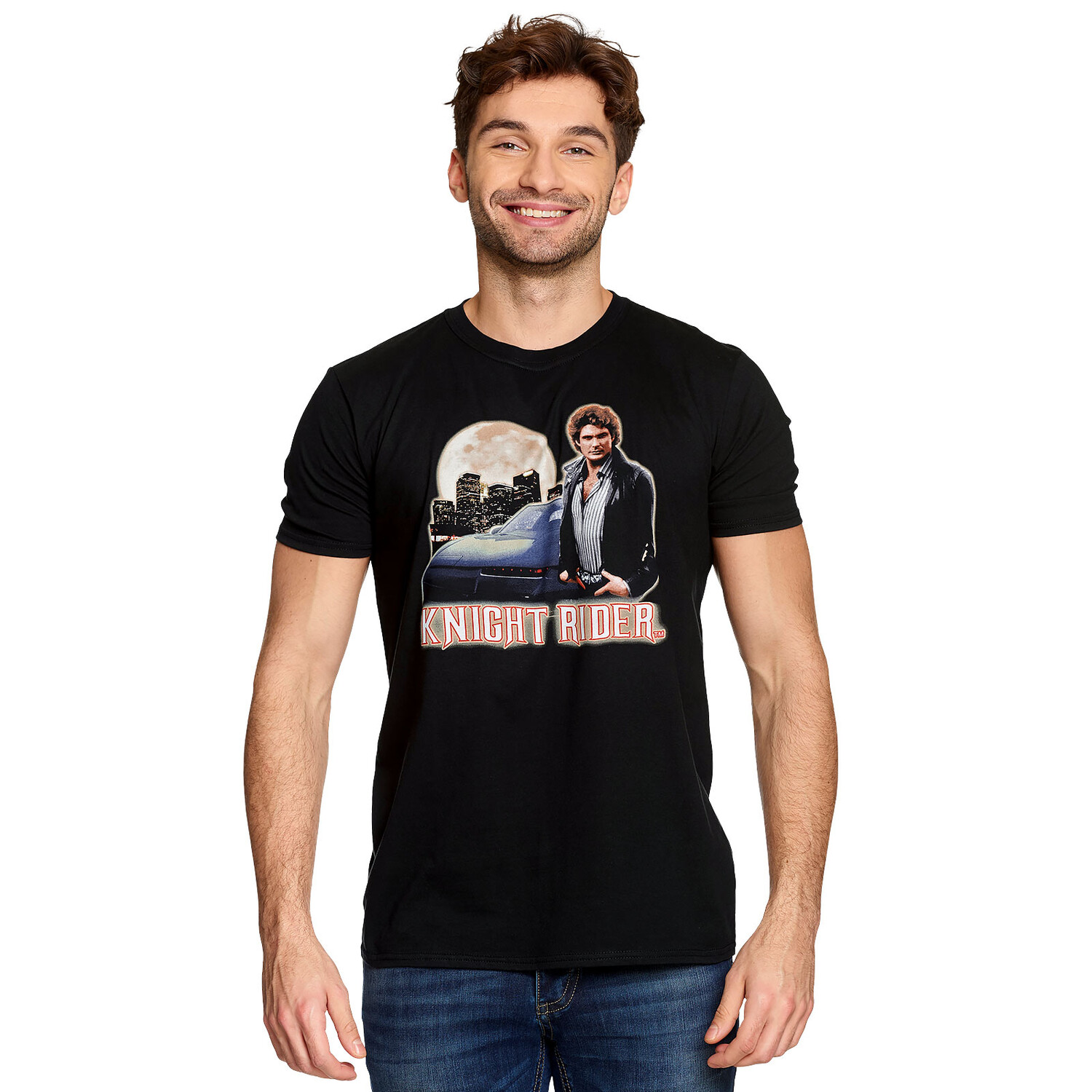 - скидка до улицы с вами Майкл Найт и КИТТ! Наша официально лицензированная футболка Knight Rider подарит незабываемые ностальгические впечатления. На принте спереди Майкл и его верная машина изображены в лучшем свете. Прямой крой и круглый вырез гарантируют комфорт и прохладу. Теперь все, что вам нужно, это подходящая кожаная куртка, и вперед! Потому что в этой футболке ты почувствуешь себя настоящим Рыцарем дорог. Так чего же вы ждете? Получите его и станьте героем на улице. Инструкция по уходу: Можно стирать при 40°C.