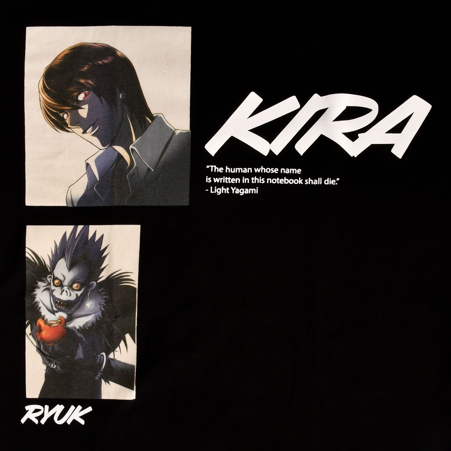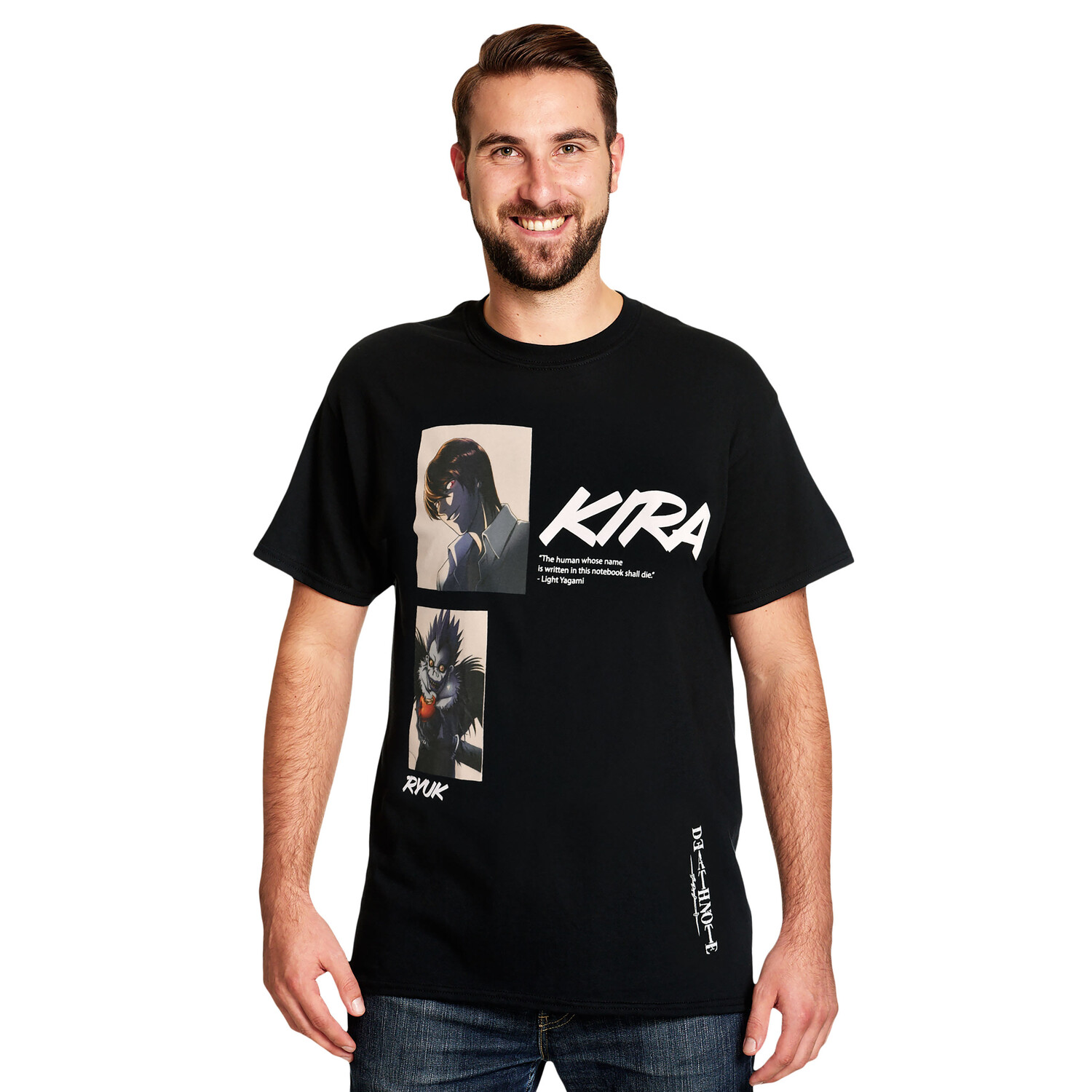 - Готовы ли вы отправиться в самое сердце тьмы? Тогда эта официально лицензированная футболка Death Note идеально вам подойдет! На лицевой стороне изображен масштабный мотив Лайта Ягами, более известного как Кира, а также синигами Рюк и яркая цитата. На подоле также есть небольшой логотип Death Note, показывающий, что вы настоящий фанат. Эта футболка прямого кроя и классического круглого выреза не только очень удобна, но и привлекает внимание. Идеально подходит для всех поклонников аниме и манги, которые любят приправить свой стиль щепоткой тьмы. С этой футболкой вы сможете поднять свой статус фаната на новый уровень и одновременно разнообразить свой гардероб.