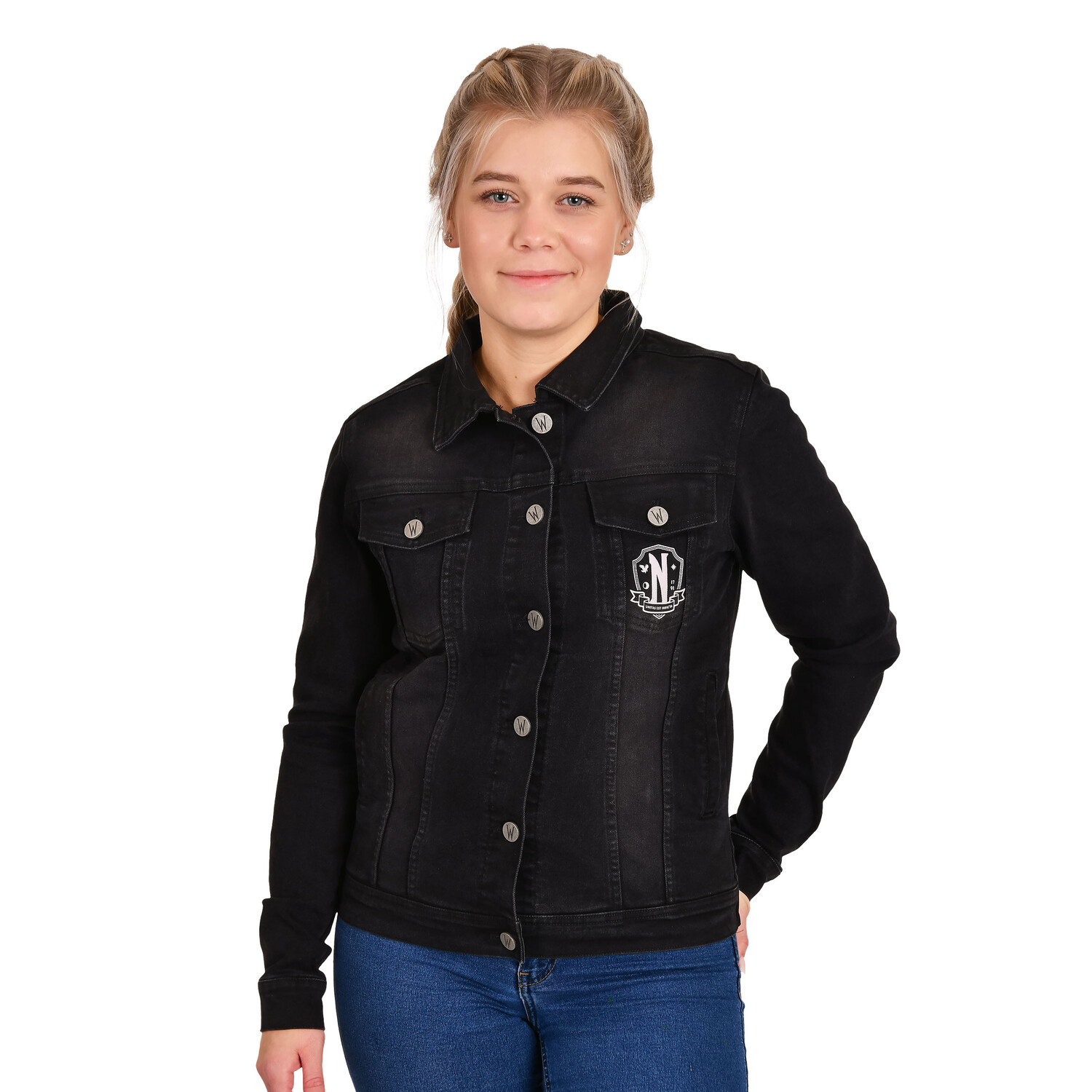 - Готовы ли вы ощутить темную сторону моды? Тогда официально лицензированная черная джинсовая куртка Wednesday — Nevermore Academy — то, что вам нужно! Эта куртка с крупноформатным принтом Nevermore Academy на спине и принтом с логотипом спереди является настоящим украшением. Два накладных нагрудных кармана и два боковых кармана вместят все ваши загадочные находки. Кнопки с тисненым символом W подчеркивают неповторимый образ среды. В этой куртке вы не только привлечете внимание, но и воплотите дух Nevermore Academy. Погрузитесь в мир среды и покажите всем, что вы являетесь частью Академии. Инструкция по уходу: Можно стирать при 30°C!