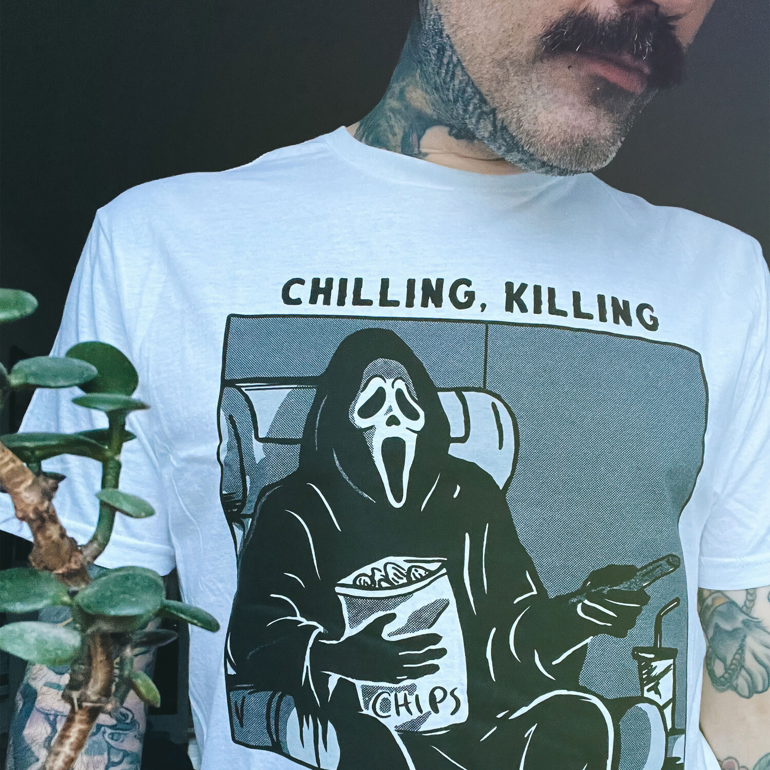 - большой принт спереди Ghost Face с надписью Chilling, Killing