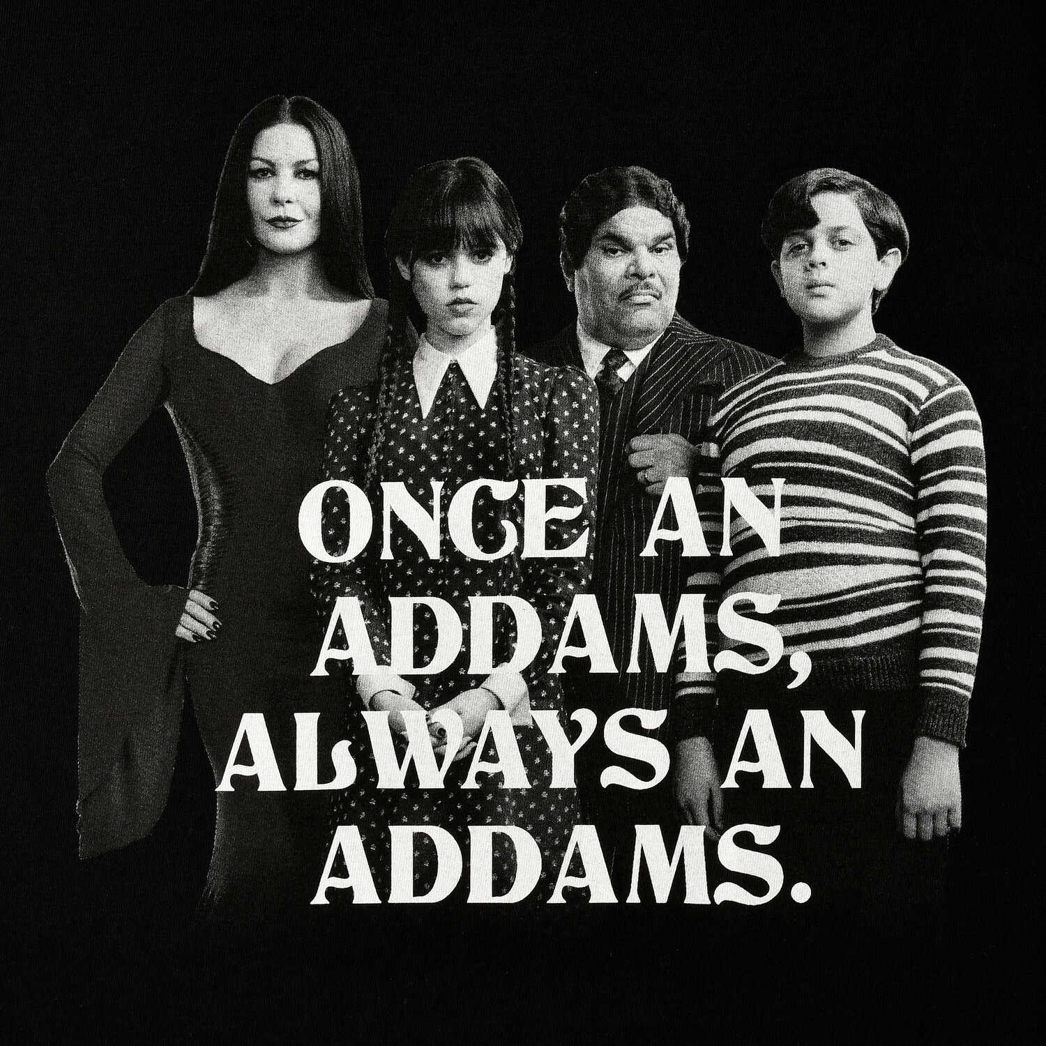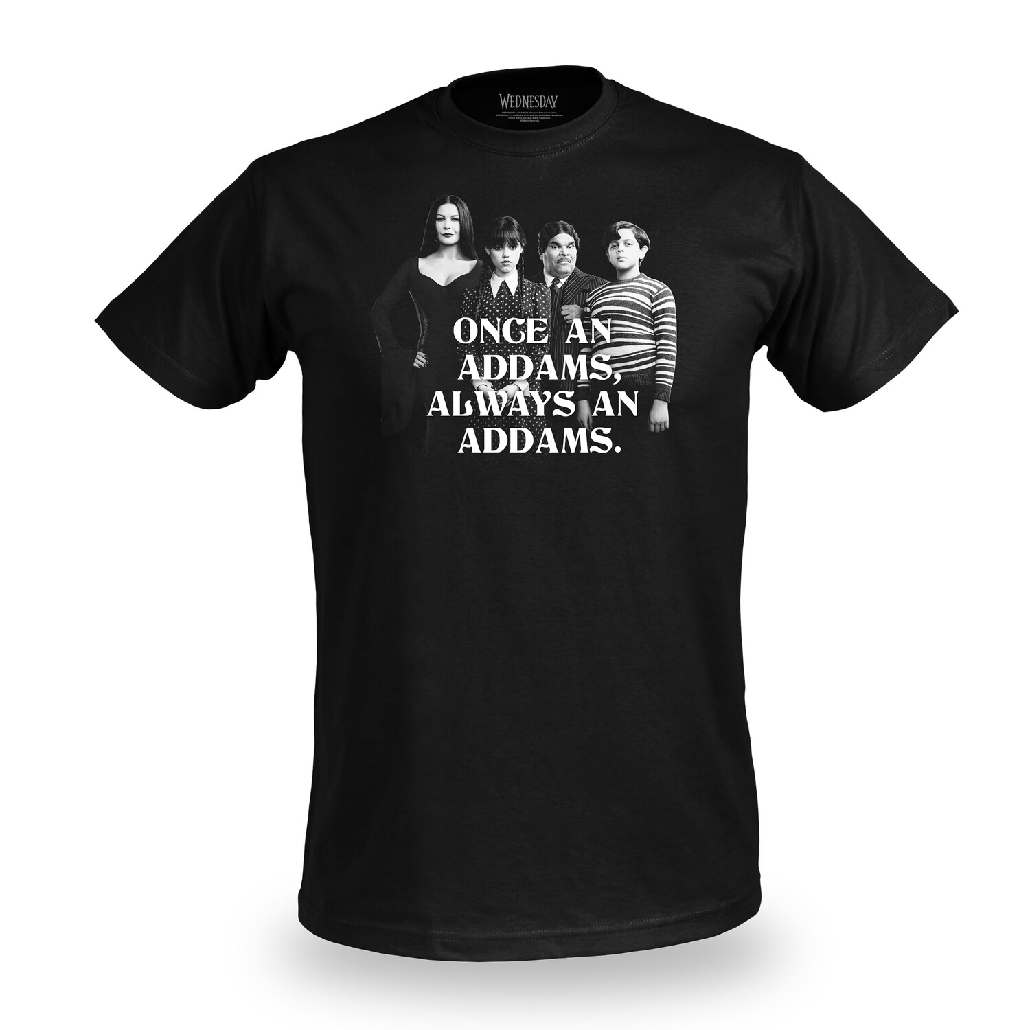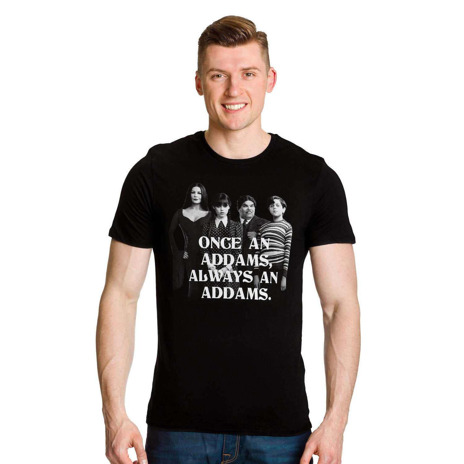 - официально лицензированная футболка «Семейка Аддамс» спереди с принтом «Семейка Аддамс» спереди и надписью «Однажды Аддамс всегда Аддамс»