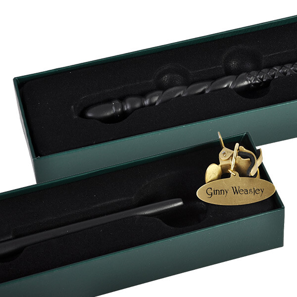 - Джинни — единственная девочка наряду с шестью братьями в семье Уизли. Она на год младше Гарри и также является членом Дома Гриффиндора и Армии Дамблдора. Именно ее убеждает Лорд Волан-де-Морт натравить монстра на своих одноклассников в Тайной комнате. Волан-де-Морт похищает Джинни, но Гарри удается ее спасти. Гарри был ее тайным поклонником на протяжении многих лет, а позже они поженились. Палочка Джинни окрашена в матовый черный цвет и имеет гладкую поверхность. Ручка украшена закрученной структурой в виде каротажной ленты.