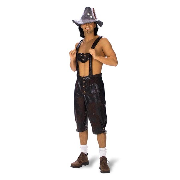 - Брюки изготовлены из материала, напоминающего кожу, в типичном дизайне ледерхозен: подтяжки, шнуровка на штанинах, застежка на пуговицы. Вы можете сделать свой наряд еще более аутентичным с помощью шляп, традиционных носков и традиционной обуви, а затем отправиться на Октоберфест!