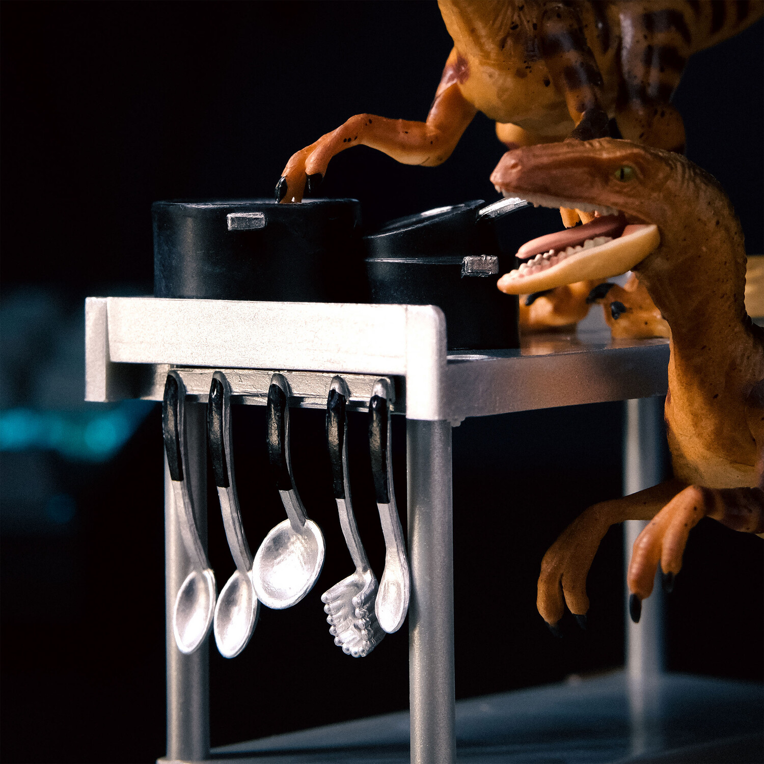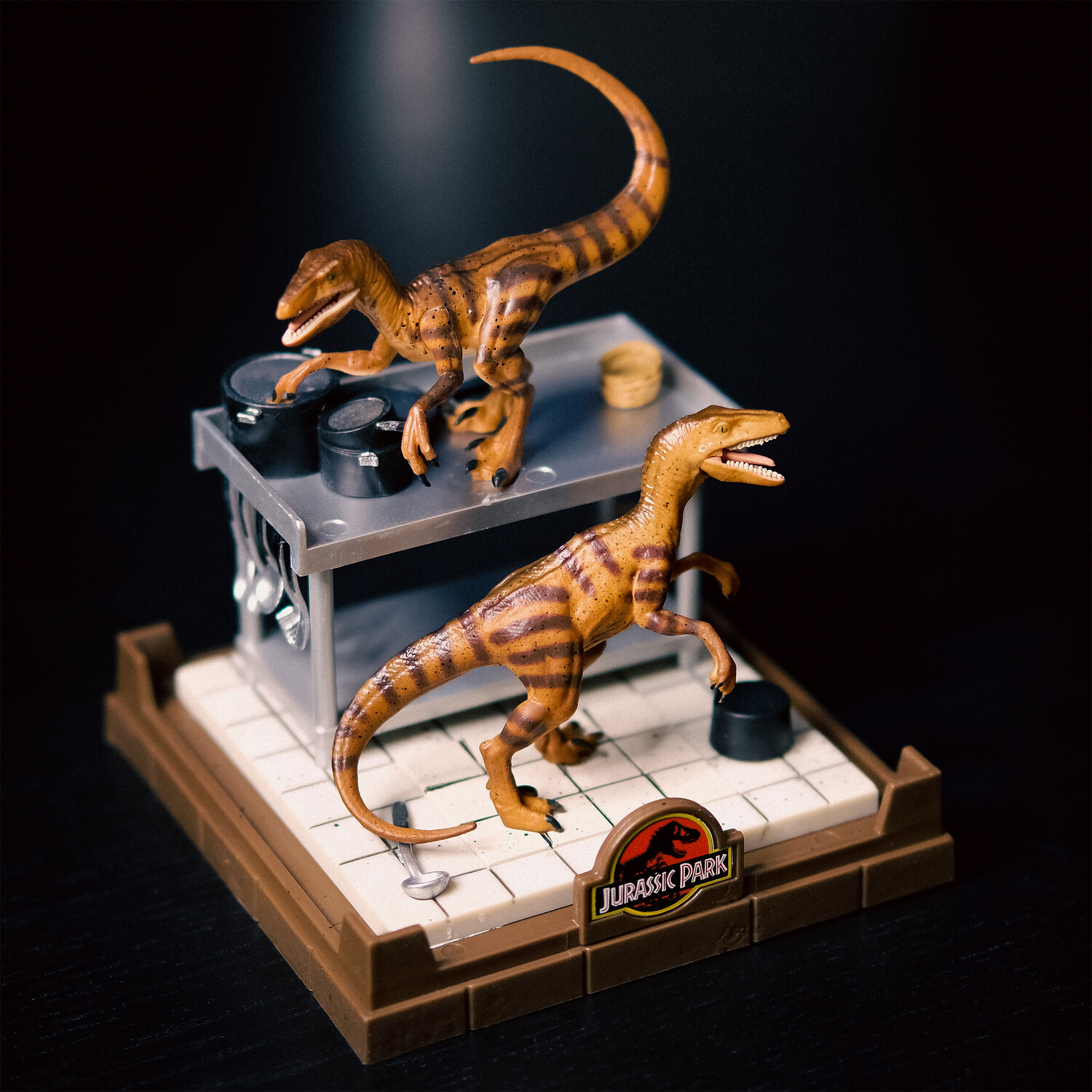 - 2 фигурки динозавров-велоцирапторов в лаборатории Noble Collection