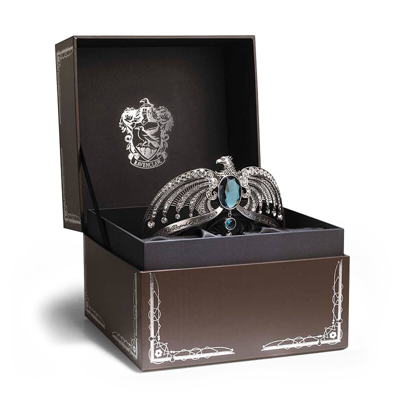 - Ровена Рейвенкло, одна из самых умных ведьм своего времени и одна из основателей школы Хогвартс владела этой чудесной тиарой. Волшебный головной убор из мира Гарри Поттера представляет собой сочетание посеребренной латуни с белыми и синими кристаллами. Ворон возвышается над всем как геральдическое животное Когтевранов, и его девиз также можно прочитать здесь: Остроумие без меры — величайшее сокровище человека. (Избыток свидетелей — величайшее сокровище человека.)