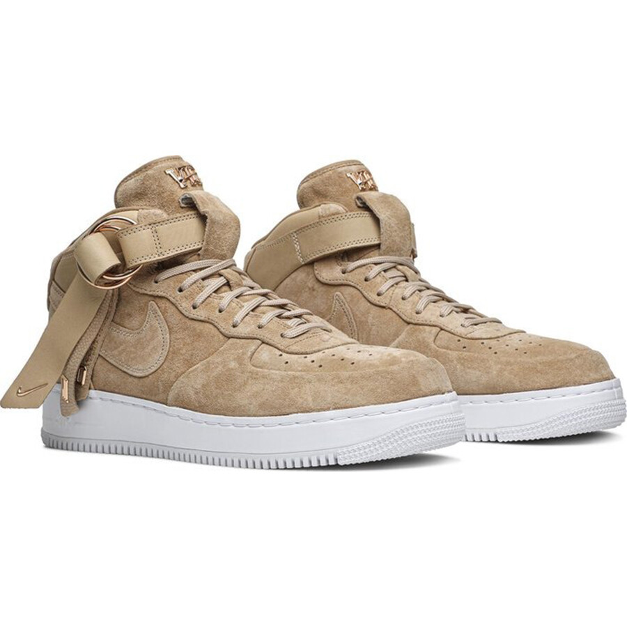 Мужские кроссовки Nike Victor Cruz x Air Force 1 Mid. Верхняя часть кроссовок выполнена из замши цвета Vachetta Tan, а кожаный ремешок на щиколотке украшен кольцами из розового золота. Различные детали, связанные с Victor Cruz, такие как его номер 80, также присутствуют на многослойных ремешках, в то время как остальной дизайн верхней части контрастирует с классической белой подошвой Air.