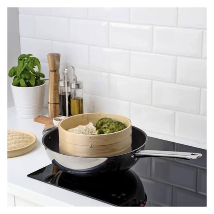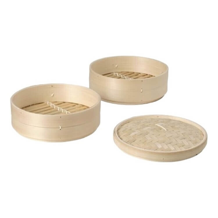 Используйте бамбуковую пароварку с широкой сковородой или воком, которые должны быть наполнены водой таким образом, чтобы вода не достигала дна корзины.