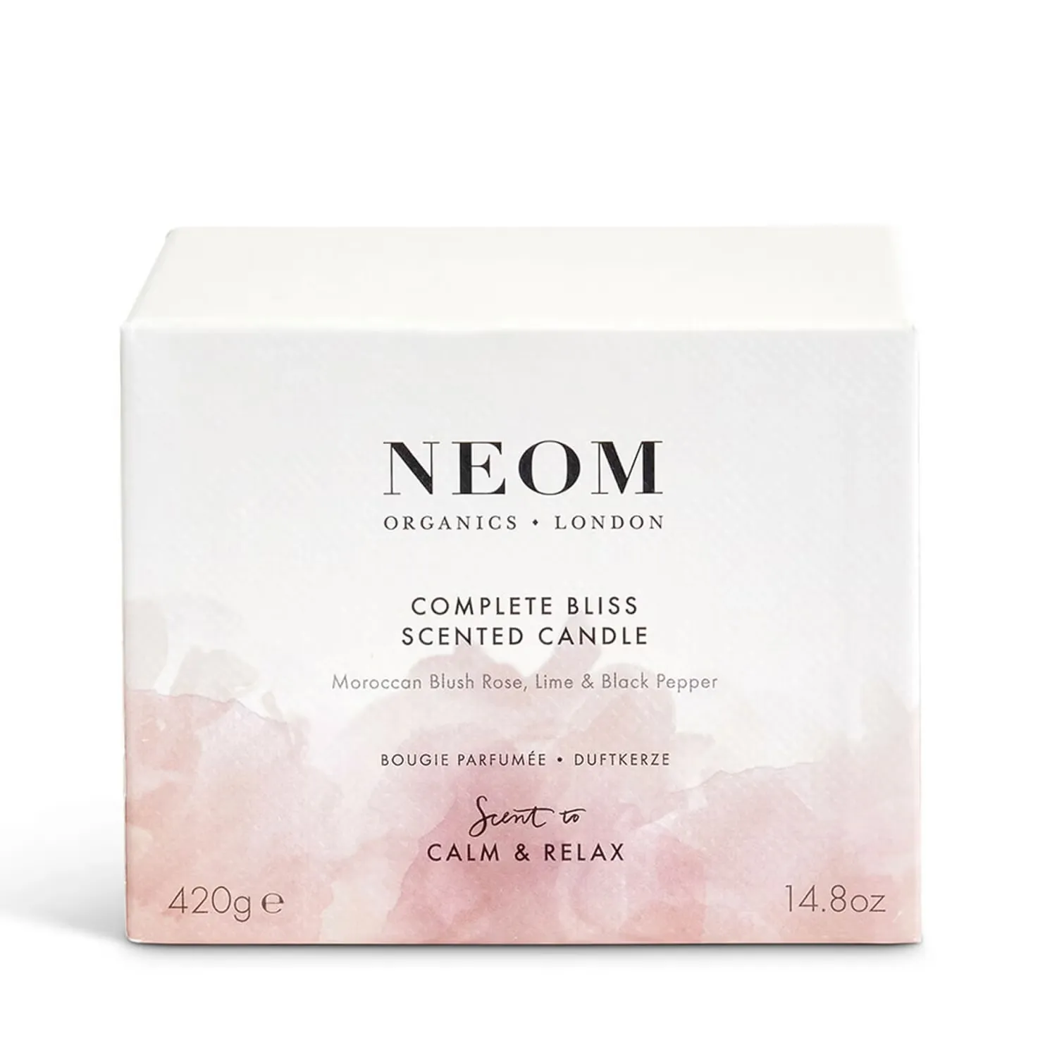 Роскошная ароматическая свеча NEOM Organics Complete Bliss наполнит вашу комнату стимулирующим и бодрящим ароматом марокканской розы, лайма и черного перца, который стимулирует ваши чувства и помогает облегчить головные боли и сенную лихорадку. Эта свеча весом 420 г, изготовленная из чистого растительного воска и натуральных масел, имеет три фитиля и рассчитана на время горения до 50 часов. Не содержащая токсинов, эта красивая свеча будет гореть чисто и равномерно, а бодрящий аромат поднимет вам настроение. - Способ применения: Зажгите фитиль спичками или зажигалкой, соблюдая осторожность. Никогда не оставляйте свечу без присмотра или рядом с детьми. Выключайте пламя после каждого использования