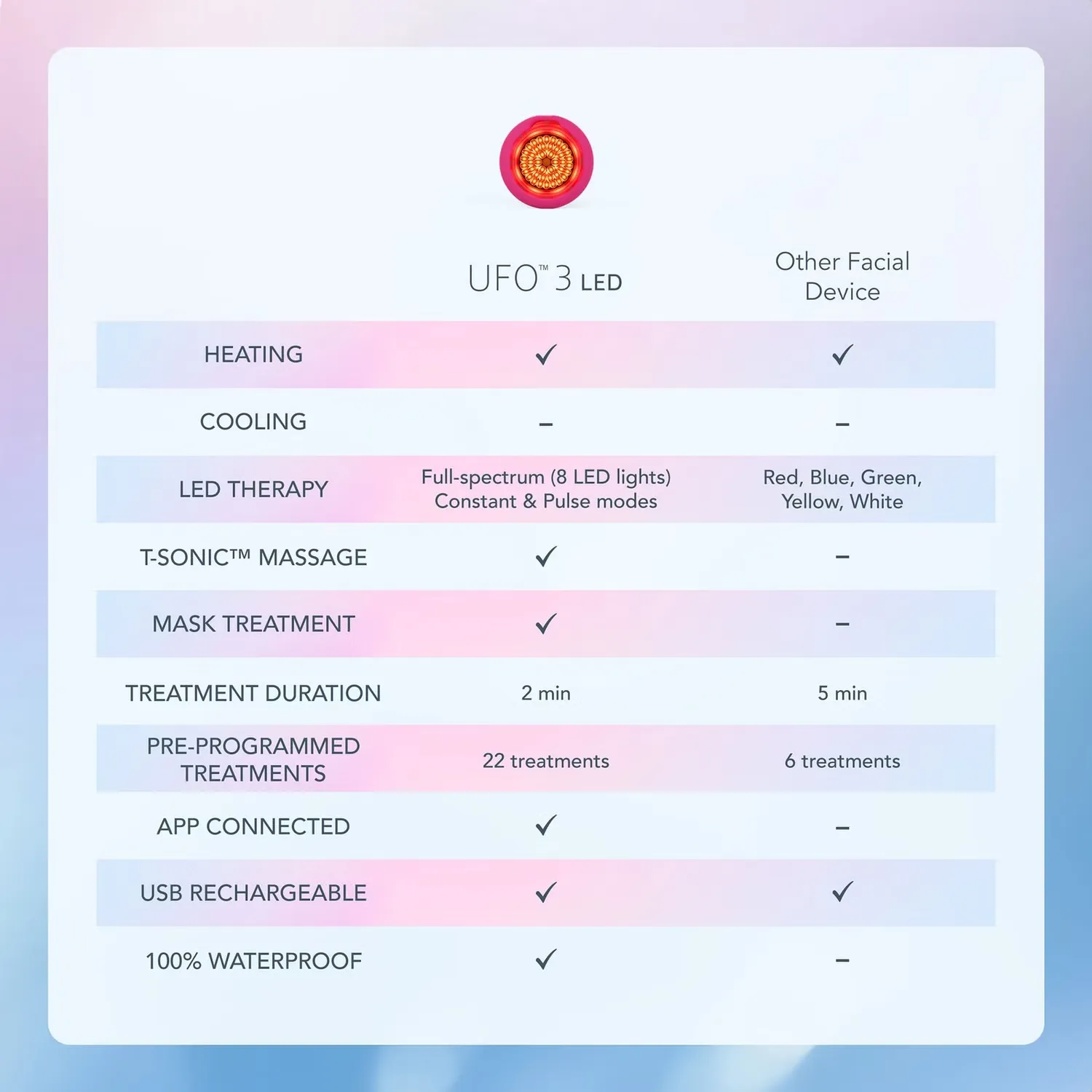 Работая вместе с активированными масками FOREO, светодиодное устройство UFO 3 повышает гидратацию кожи и заметно уменьшает тусклость благодаря передовой технологии светодиодного освещения и термотерапии. Инструмент, известный своими осветляющими свойствами, оснащен светодиодной светотерапией полного спектра (включая красный и ближний инфракрасный диапазон), придающей сияние тусклому, тусклому цвету лица. Нежное тепло помогает оптимально распределить ингредиенты маски, обеспечивая длительное увлажнение и гладкость кожи. Кроме того, технология массажа T-Sonic обеспечивает пульсацию для стимулирующего эффекта, который обеспечивает мгновенное сияние и повышенную влажность после использования.