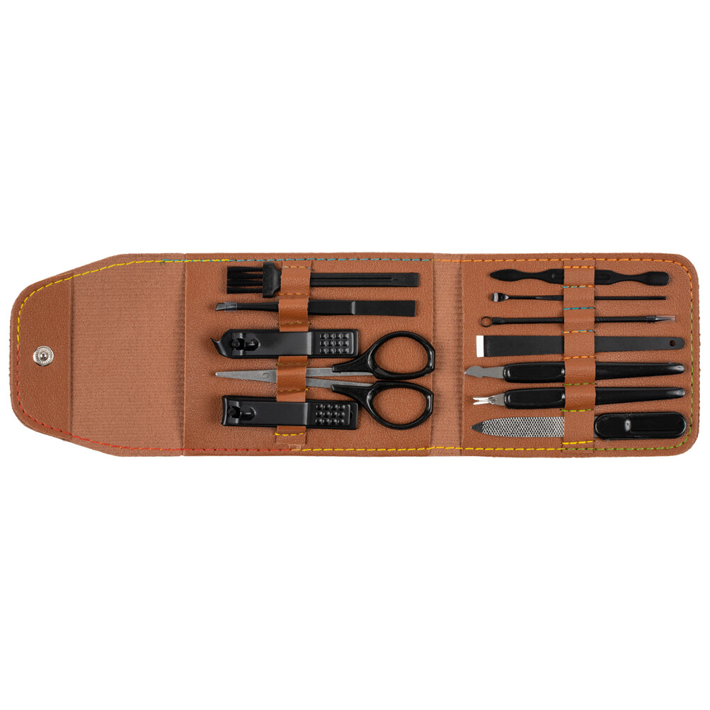 • В комплект входят ножницы, пинцет, маленькие кусачки для кутикулы. кусачки для ногтей, средство для чистки ногтей, пилочка, щетка для чистки ногтей, игла от прыщей, средство для удаления плоских мозолей, средство для чистки ушей и футляр