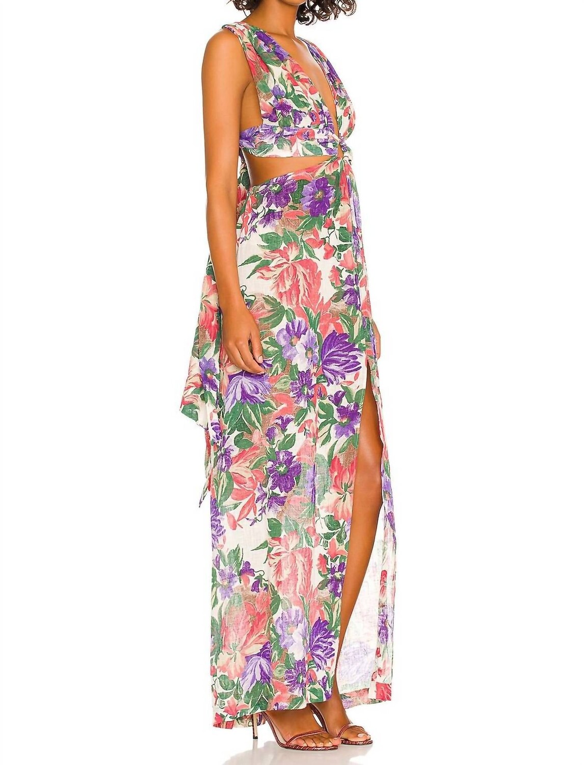 Платье макси, столь же милое, сколь и удобное. Без подкладки. Выдвижная укладка. Глубокий V-образный вырез с акцентным кольцом по центру и вырезами на талии. Открытая спина с завязками и акцентами. Деталь разреза спереди. Длина плечевого шва до подола составляет около 60 дюймов. Рост модели 5 футов 9,5 дюймов, размер модели указан. Машинная стирка. 100% Хлопок. Сделано в США.