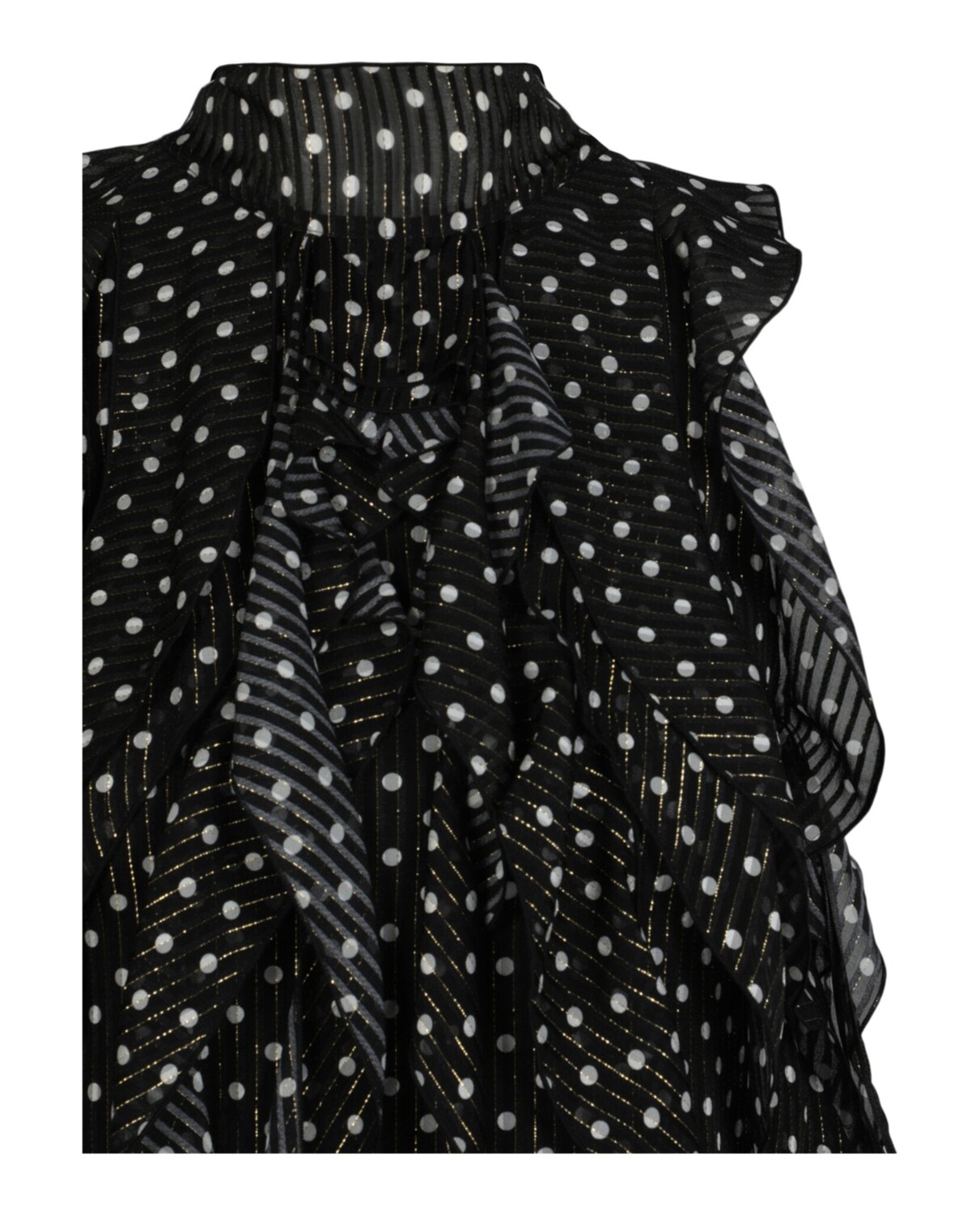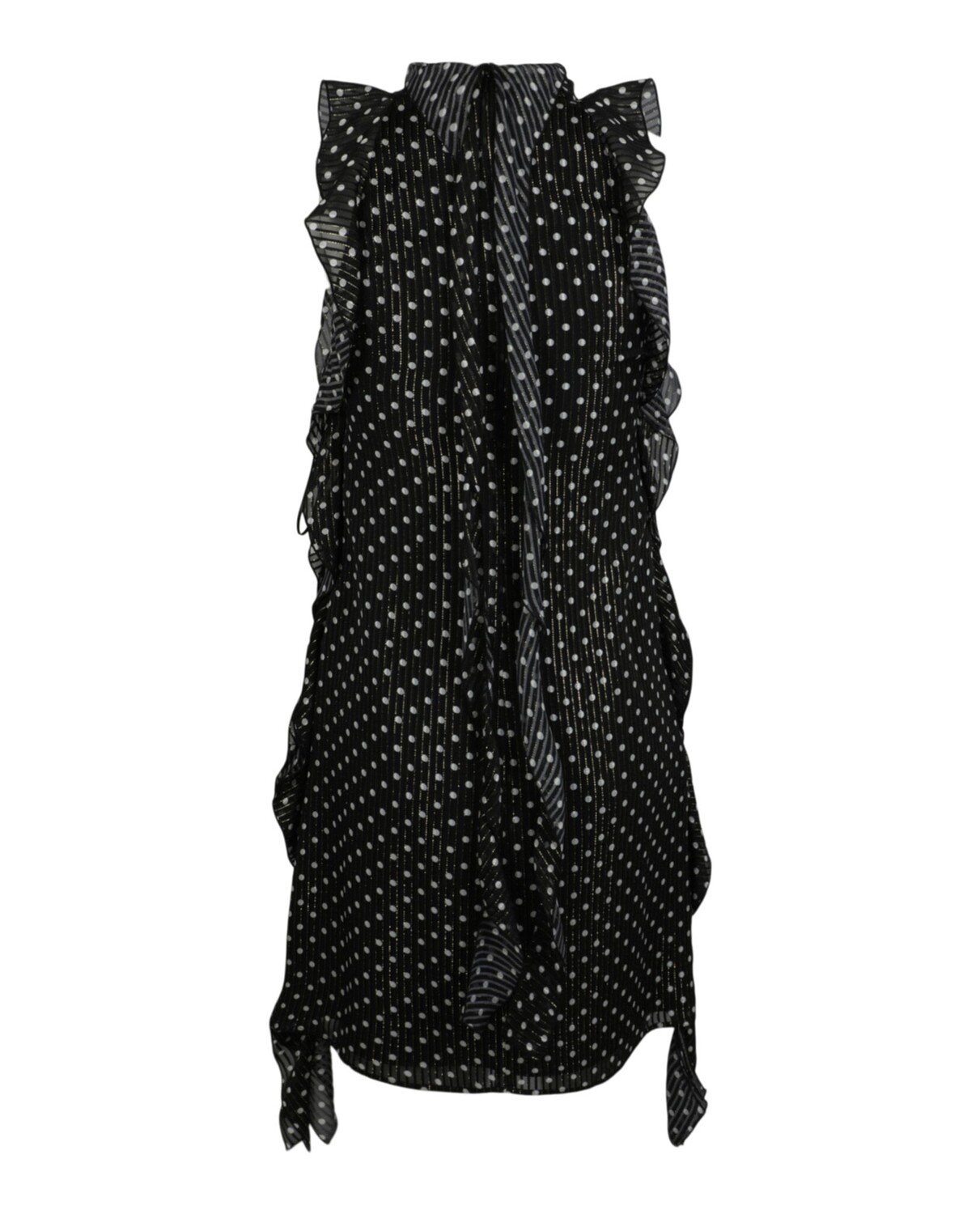 Принт в горошек по всей поверхности с полосками из металлического волокна. Только сухая чистка97 % шелк, 3 % металлическое волокно; Подкладка - 100% шелк