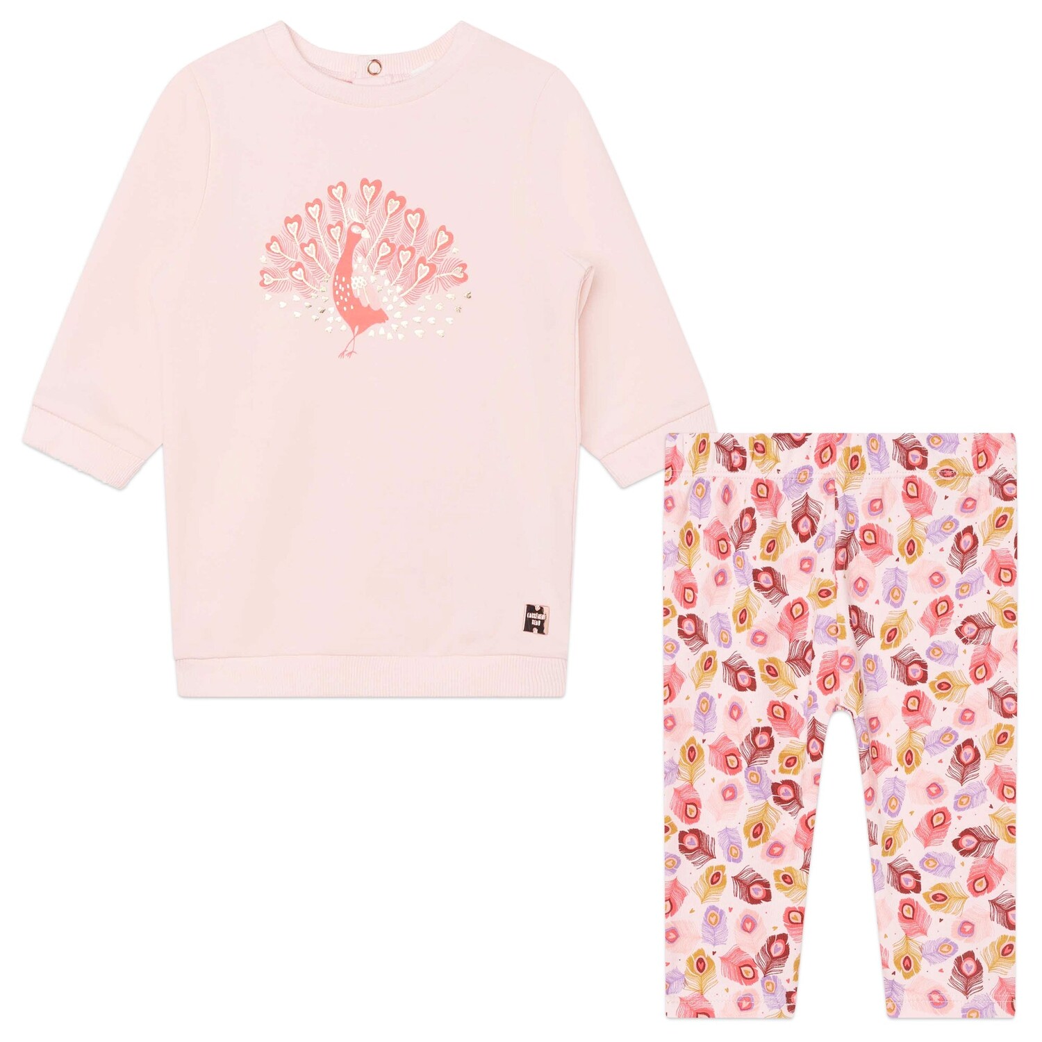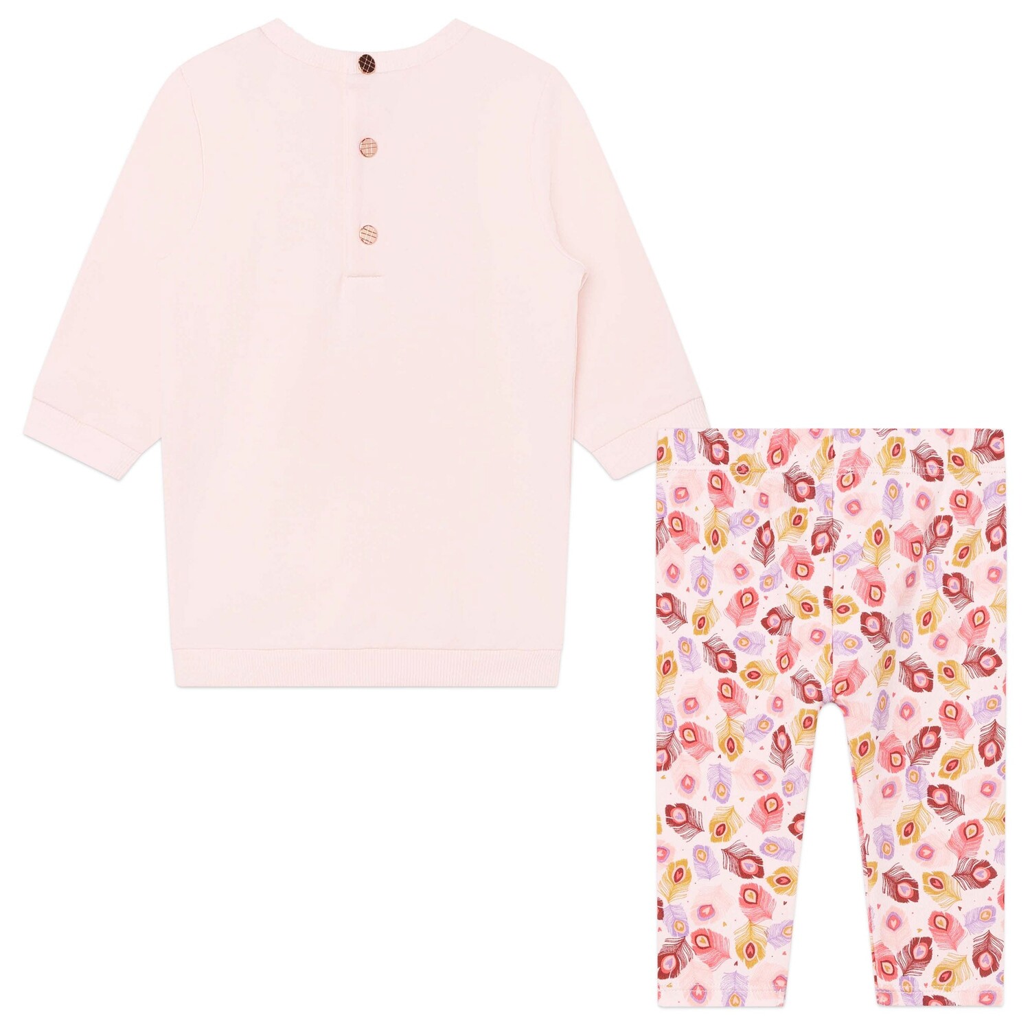 Розовое платье с павлином для девочки от Carrament Beau. Бледно-розовое платье-свитер с изображением павлина и брюки в тон с павлиньим принтом. Графика с павлином. Круглый вырез. Длинные рукава. Платье — 95 % хлопок, 5 % эластан. Брюки — 91 % хлопок, 9 % эластан