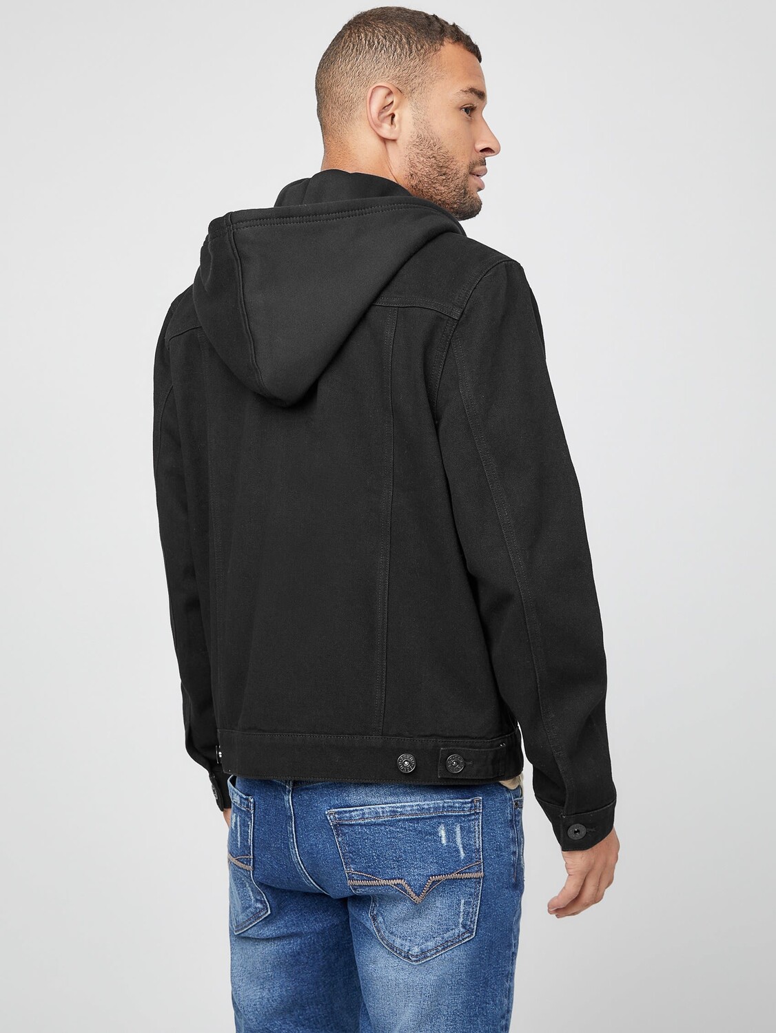 Эта джинсовая куртка, являющаяся незаменимым элементом одежды, имеет два нагрудных кармана, застежку на пуговицы спереди и прикрепленный капюшон с завязкой на шнурке.