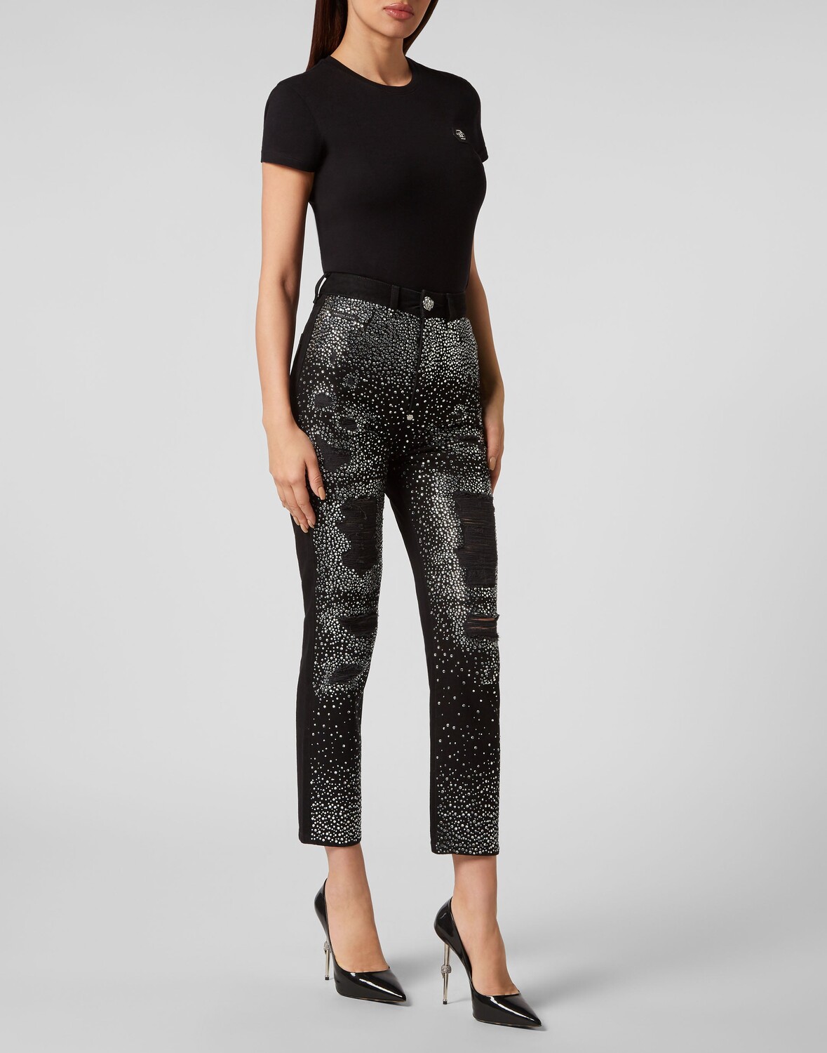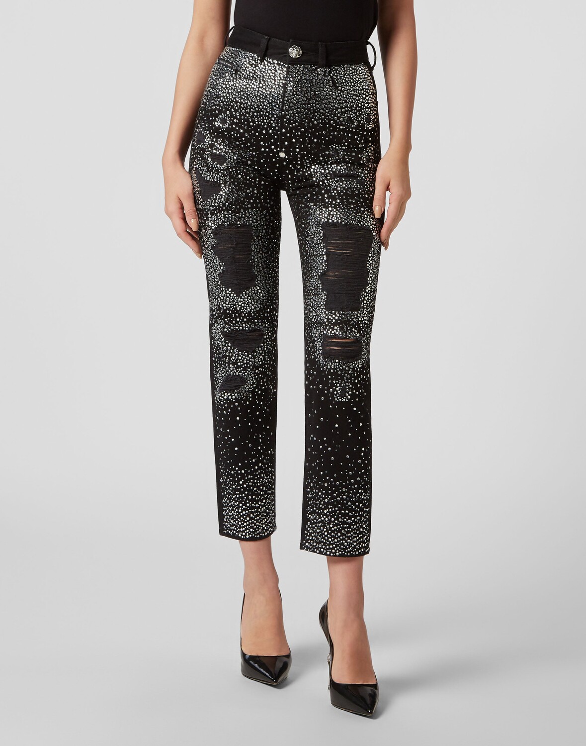 Вы хотите выделиться? Тогда мы предлагаем эти брюки из потертого денима с пятью карманами и уникальными ценными деталями. Узнайте больше. ● Джинсовая ткань с потертостями и потертостями, создающими потертый вид ● Передняя часть украшена стразами ● Кольцо для пирсинга с драгоценным камнем висит на крючке по центру спины ● Одна пуговица с металлическим украшением ● Модель – High-Rise Boyfriend
