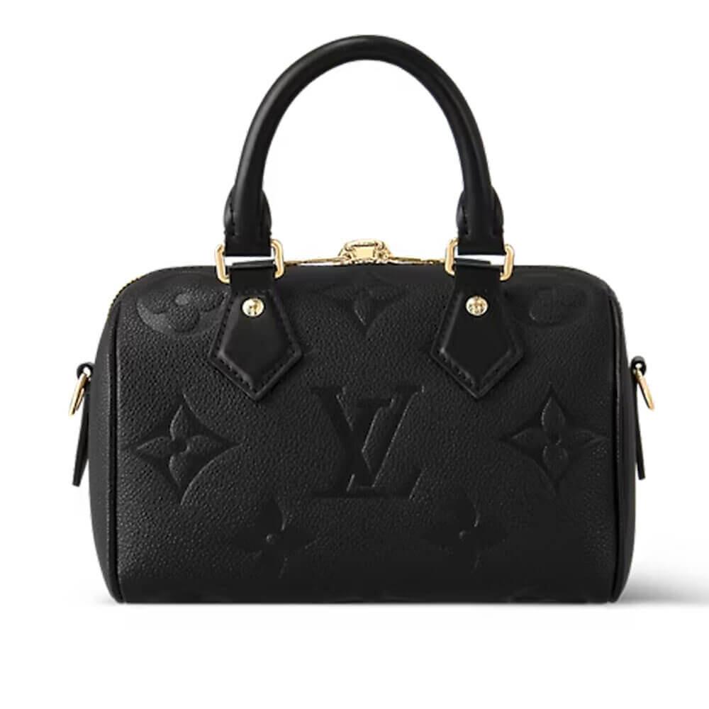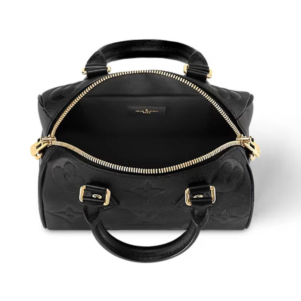 Модная компактная сумка Speedy Bandoulière 20 как раз подходящего размера для повседневных вещей. Она изготовлена из гладкой зернистой кожи с тиснением в виде объемной монограммы Empreinte. Фурнитура и висячий замок золотистого цвета. В дополнение к двум ручкам прикреплен изящный ремешок–цепочка, который можно снимать и регулировать.