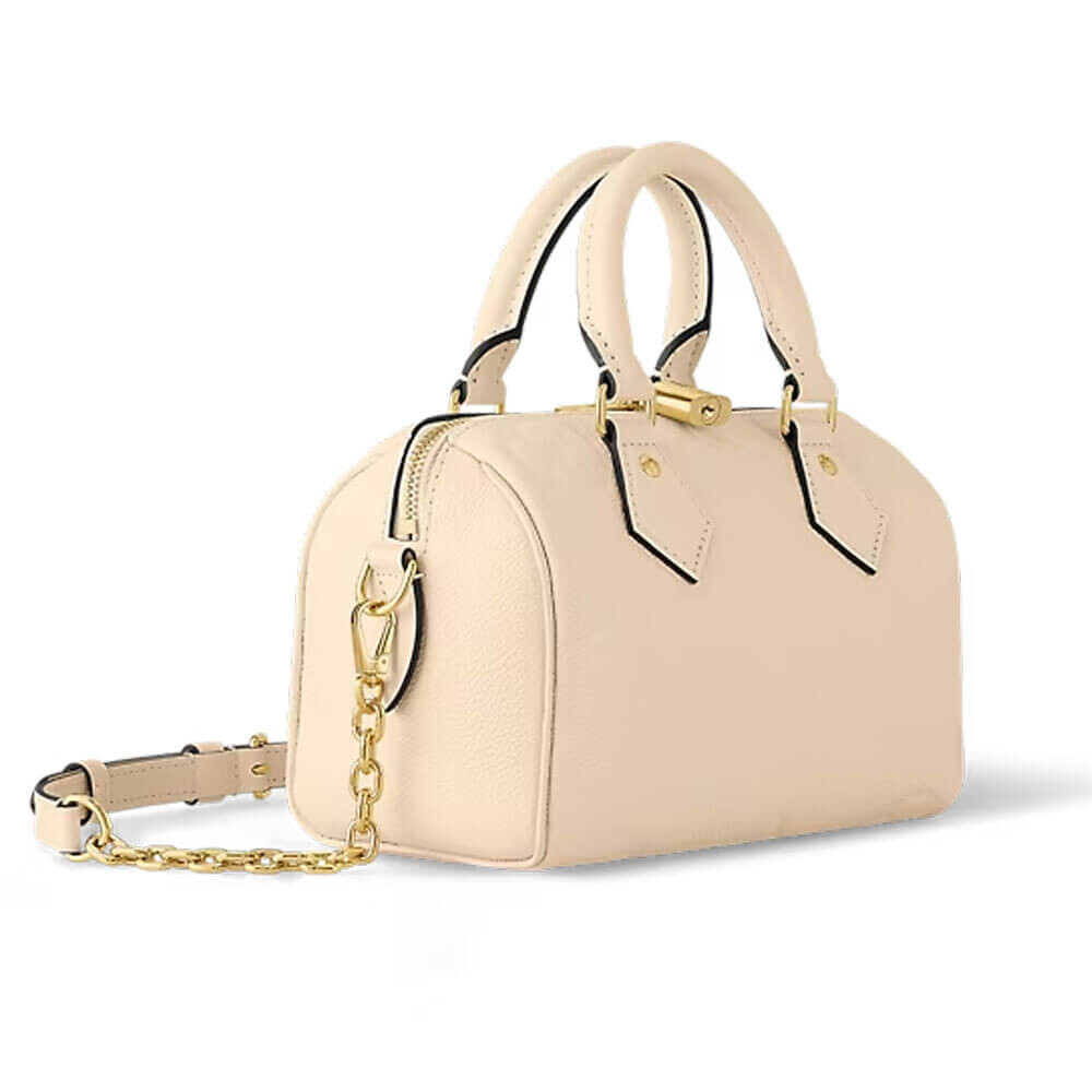 Модная компактная сумка Speedy Bandoulière 20 как раз подходящего размера для повседневных вещей. Она изготовлена из гладкой зернистой кожи с тиснением в виде объемной монограммы Empreinte. Фурнитура и висячий замок золотистого цвета. В дополнение к двум ручкам прикреплен изящный ремешок–цепочка, который можно снимать и регулировать.