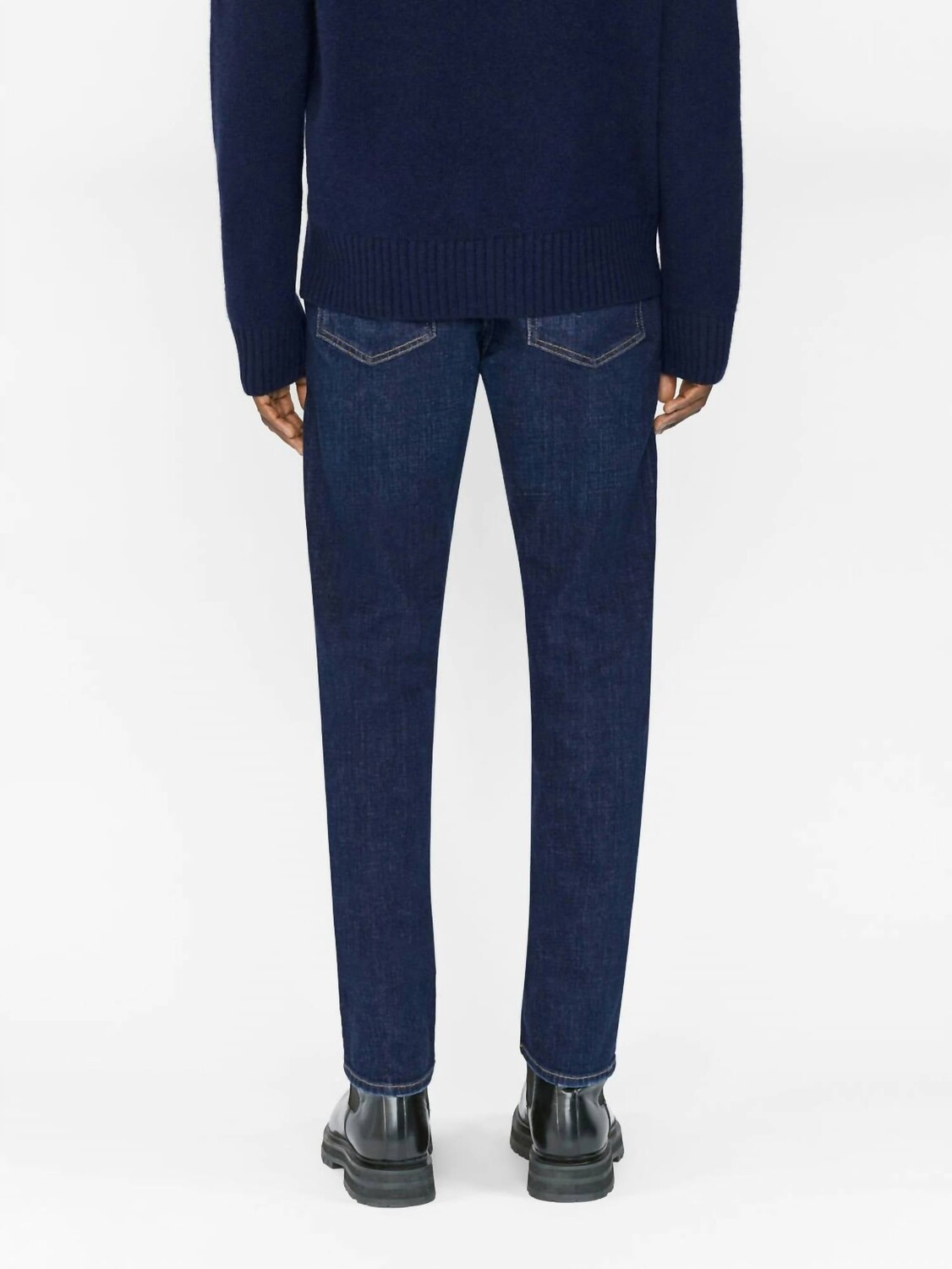Фирменные узкие прямые брюки из денима премиум-класса темно-синего цвета. Классическая конструкция с пятью карманами, стандартная талия со средней посадкой и узкие прямые брючины со слегка суженным к низу манжетом. 95% хлопок, 4% полиэстер, 1% эластан. Застежка-молния. Внутренний шов - около 32". Машинная стирка в холодной воде, наизнанку.