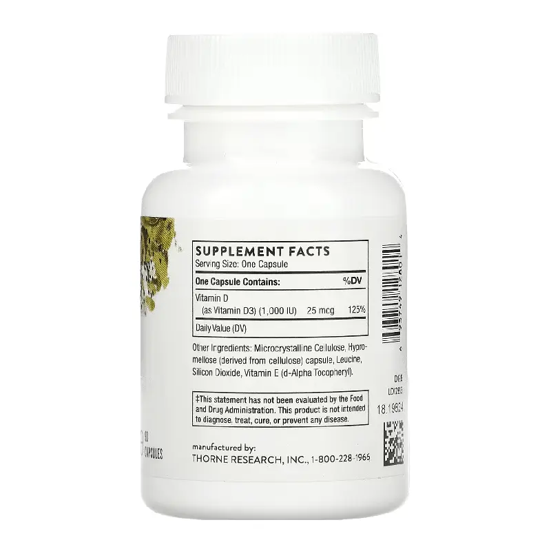 Витамин D способствует укреплению костей и мышц, нормальной работе сердечно-сосудистой системы и иммунитета. В отличие от многих других пищевых добавок с витамином D, препарат Thorne не содержит лактозы и консервантов (бутилоксианизола, бутилгидрокситолуола, бензоата натрия, и т.д.).