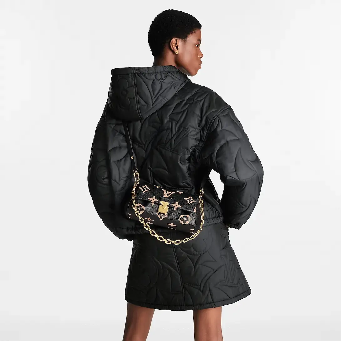 Сумка Favorite - модная багетная сумка из мягкой зернистой кожи с объемным тисненым рисунком в виде монограммы. Женственные складки придают изделию модный вид, а золотистый магнитный замок напоминает о наследии Louis Vuitton. Съемный регулируемый ремешок позволяет носить ее через плечо или в руке, а съемная цепочка золотого цвета обеспечивает более гламурный вечерний образ.