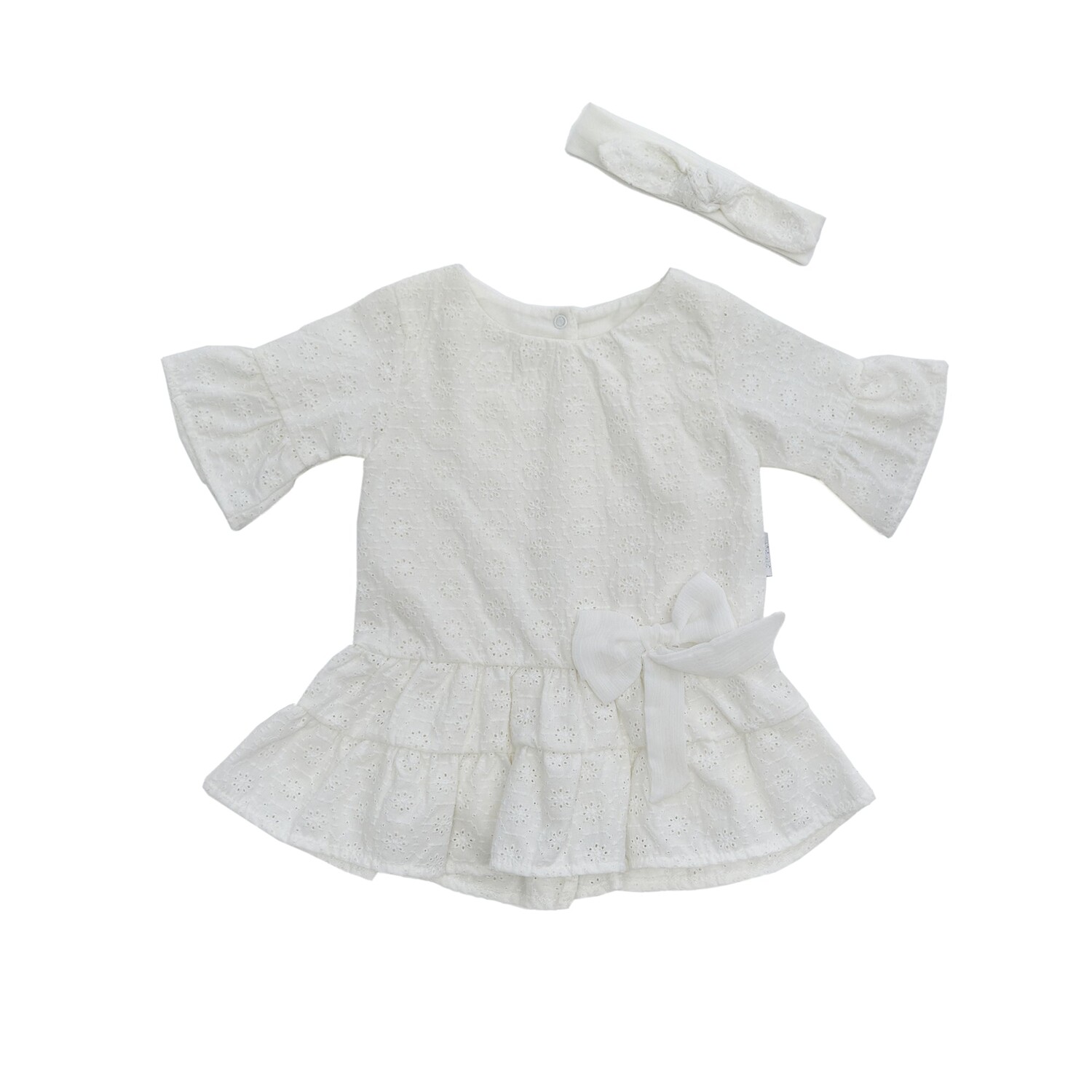 Белое стильное хлопковое платье и повязка на голову для малышек от Andy Wawa. Круглый вырез, длинные рукава-колокольчики, милый бант на подоле с застежкой на пуговицы и подходящая повязка на голову. Изготовлен из 100% натурального хлопка, он придает особую мягкость нежной коже ребенка