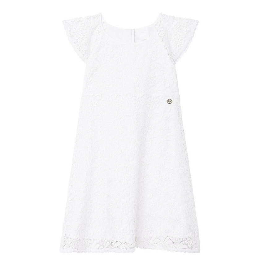 Платье вышивки с рюшами от MICHAEL KORS KIDS. Белый цвет, английская вышивка, круглый вырез, короткие рукава, золотистая бляшка с логотипом, застежка на кнопках сзади, вырез и отделка с оборками. 100 % вискоза. Машинная стирка (30*C). Артикул – R12110-10B