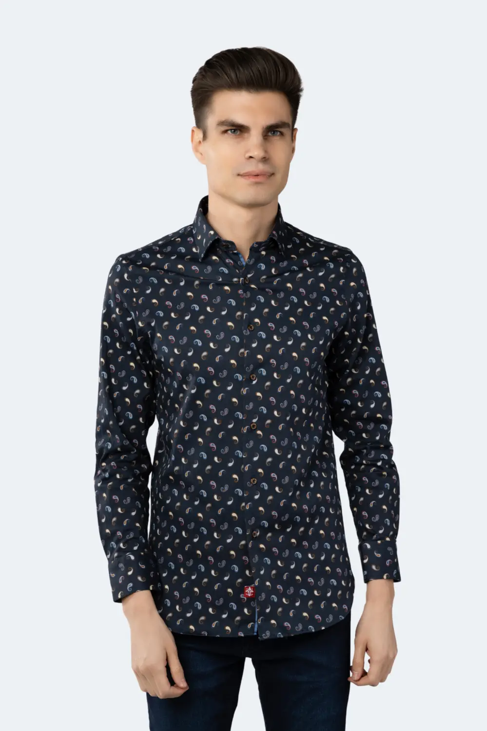 Темно-синий осень-зима 23 в сочетании с коричневой, бежевой и голубой рубашкой с узором «пейсли» от Luchiano Visconti создает элегантный и утонченный образ с оттенком роскоши. Эта изысканная рубашка на пуговицах, изготовленная из натуральной эластичной ткани, обеспечивающей гибкость и комфорт, сочетает в себе оттенки темно-синего, коричневого, бежевого и голубого цветов в замысловатом узоре пейсли. 98 % хлопок, 2 % EA.