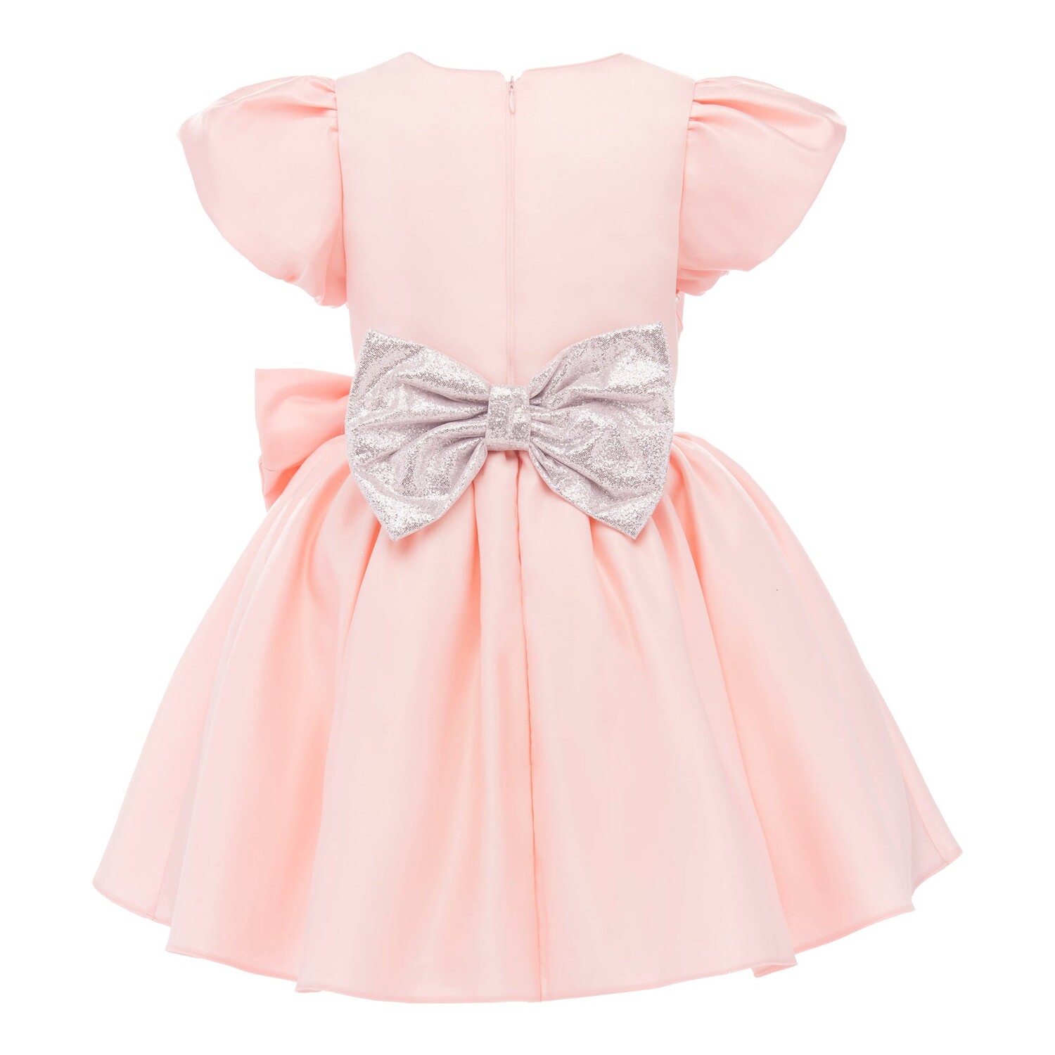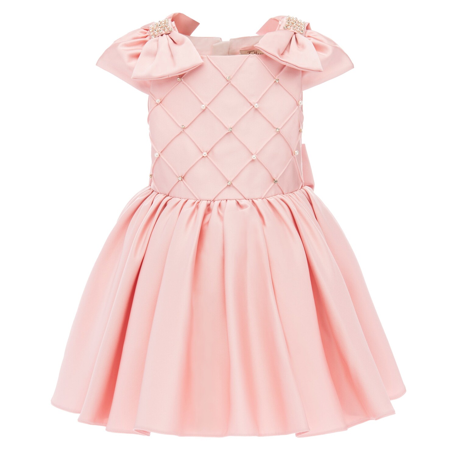 Розовое платье с бантиком в форме чашки Sevilla для девочек от Tulleen. Стеганый лиф с драгоценными камнями, рукава с рюшами, серебряный пояс с розовым бантом спереди и большой серебряный бант сзади, переходящий в пышную розовую тюлевую юбку и соответствующую повязку с бантом. 100 % полиэстер, подкладка — 100 % хлопок. Только сухая чистка