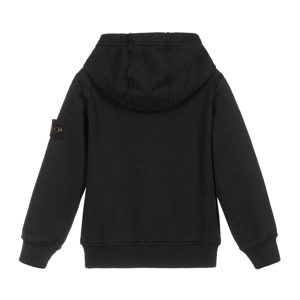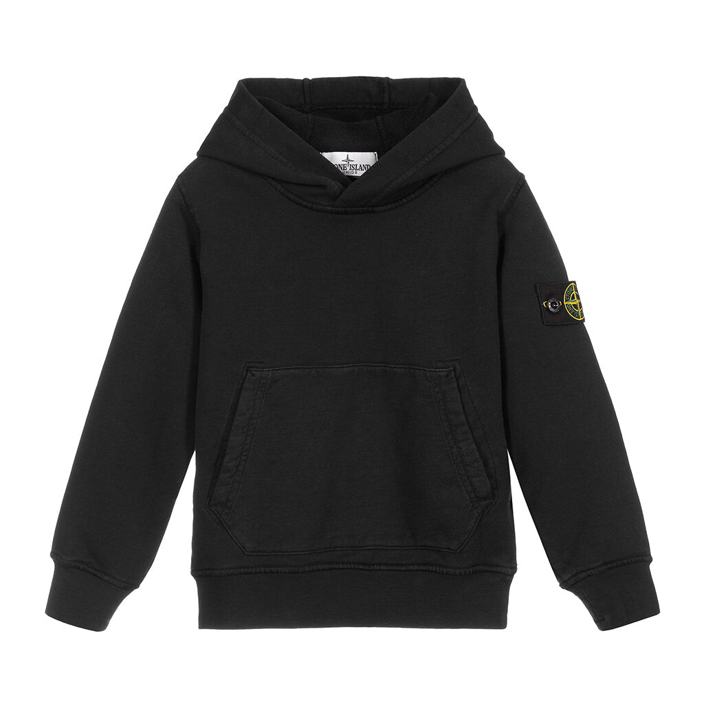 Черная толстовка с капюшоном от Stone Island Junior, выполненная из мягкого хлопкового трикотажа средней плотности. Знаменитая бирка с логотипом прикреплена к рукаву с помощью пуговиц. Спереди имеется карман-мешочек. 100 % хлопок. Машинная стирка (30*C). Артикул —  771661640-V0029.