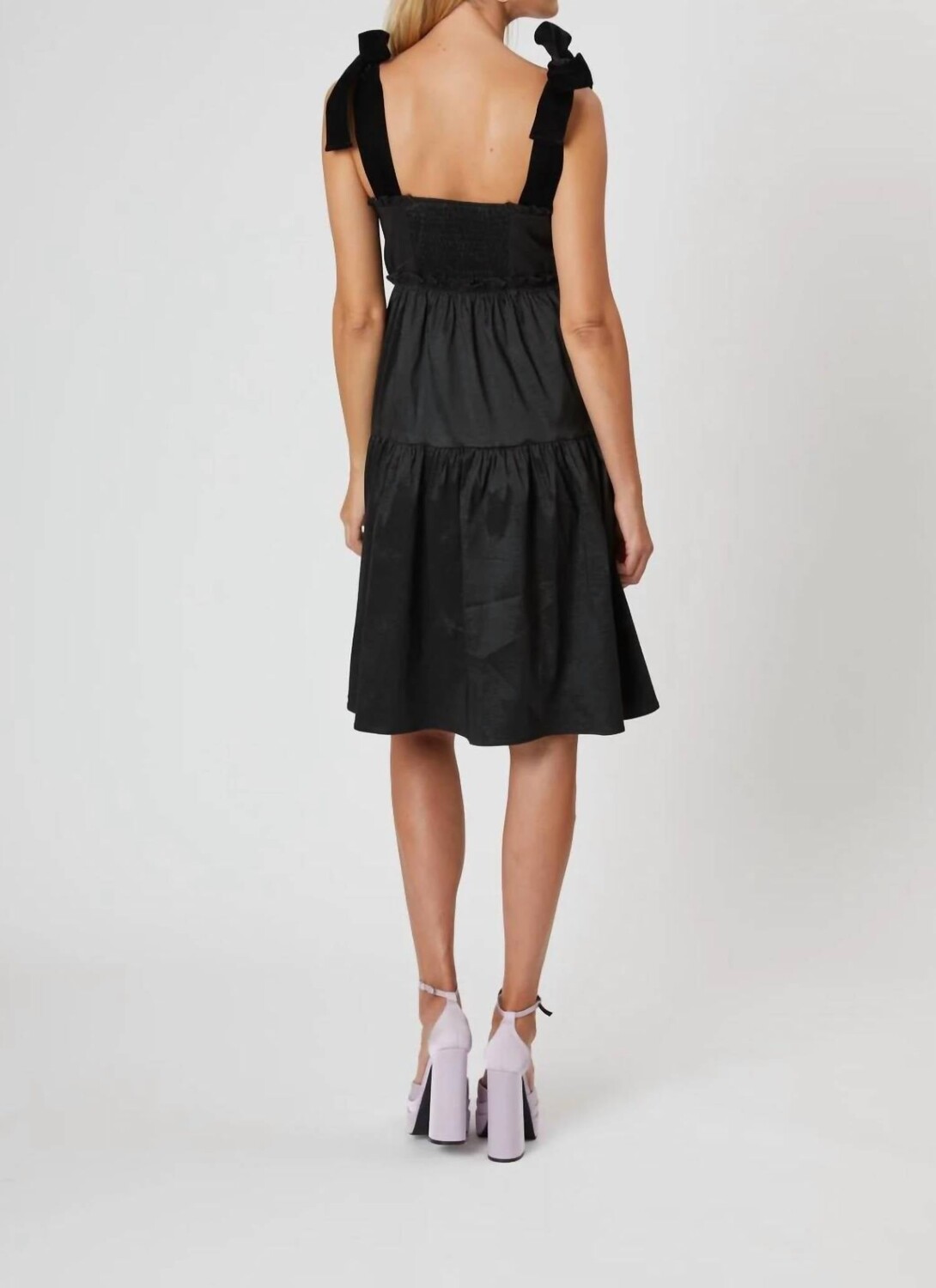 Легкое и изящное платье, которое вы сможете носить в течение всего сезона. Платье длины миди. Черный хлопок стрейч с бархатным бантом. Без рукавов. Квадратный вырез. Импортированный.