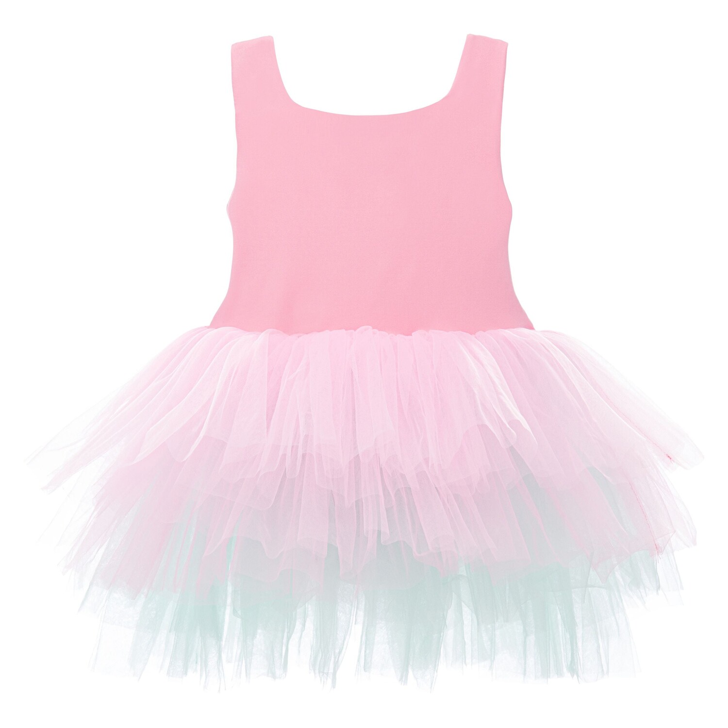 Розовое платье-купальник-пачка Bubblegum eva для девочек от Mimi Tutu. Тонкие рукава, квадратный вырез горловины и несколько слоев легкого пышного тюля с голубой тюлевой подкладкой. 100 % полиэстер, Подкладка — 100 % хлопок. Машинная стирка 30SKU —  MTL322-Eva.