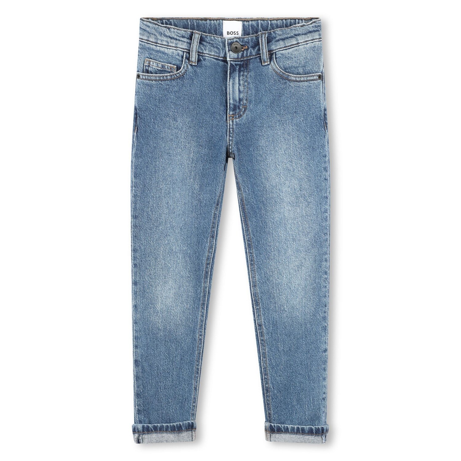 Детские джинсы стандартного кроя от BOSS из синего эластичного денима с фирменными деталями и регулируемой талией. 98 % хлопок, 2 % полиэстер. Машинная стирка (30*C)Артикул — J50687-Z25.