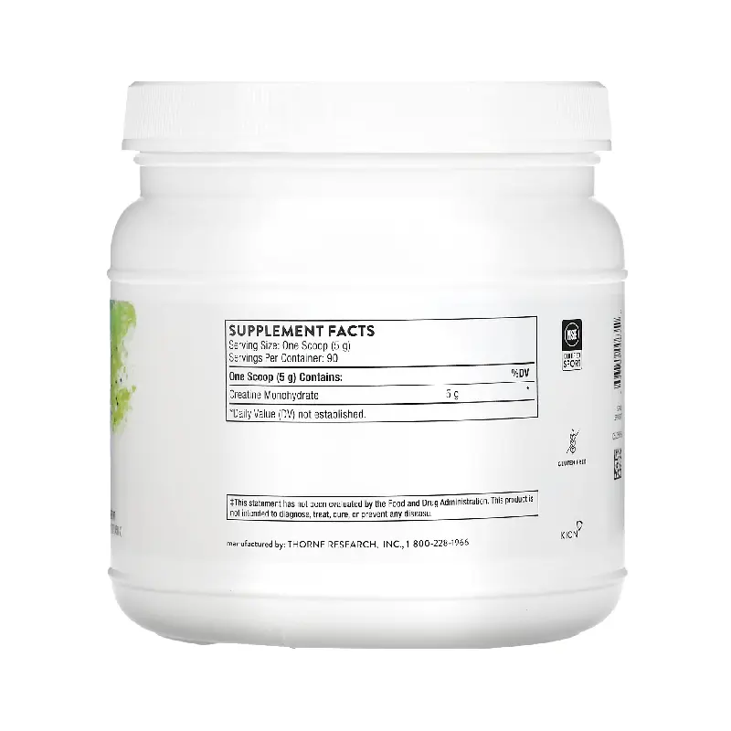 Порошок моногидрата креатина от Thorne способствует физической выносливости и увеличивает работоспособность мышц, поддерживает когнитивные функции и поддерживает здоровое телосложение, особенно у пожилых людей, способствует снижению частоты обезвоживания, мышечных спазмов и травм мышц, костей, связок, сухожилий и нервов.